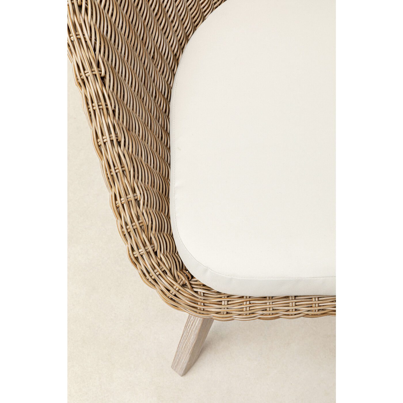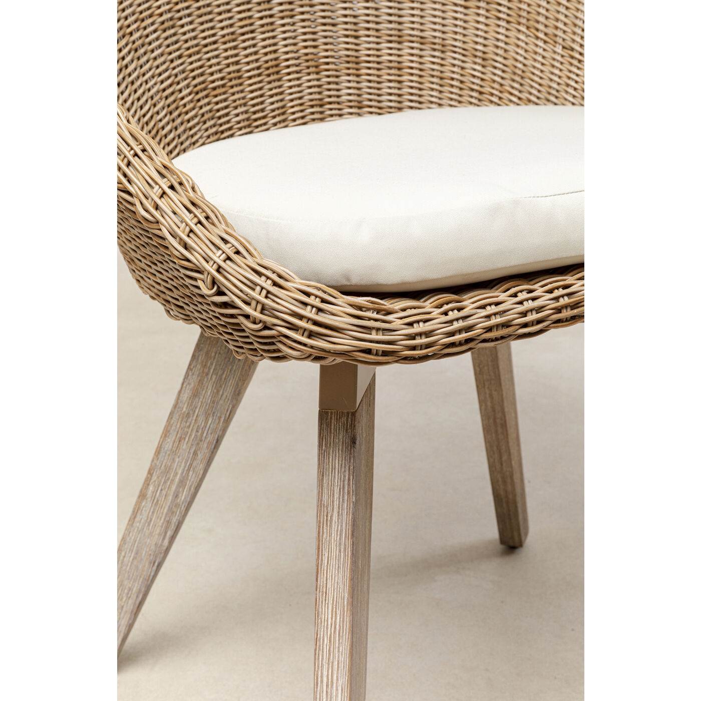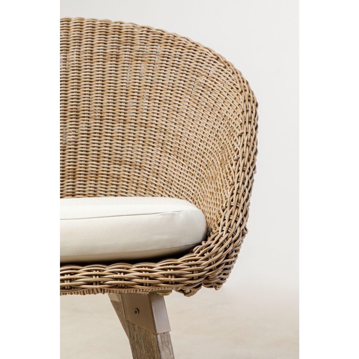 With this modern armchair, you will be investing in high-quality materials and a design that will outlast trends. Our chair for balconies, patios and gardens is designed to be a centrepiece indoors too, for example at the dining table. The rattan weave highlights the natural furnishing style. The acacia wood used for the legs is particularly robust, ensuring the longevity of this outdoor chair.