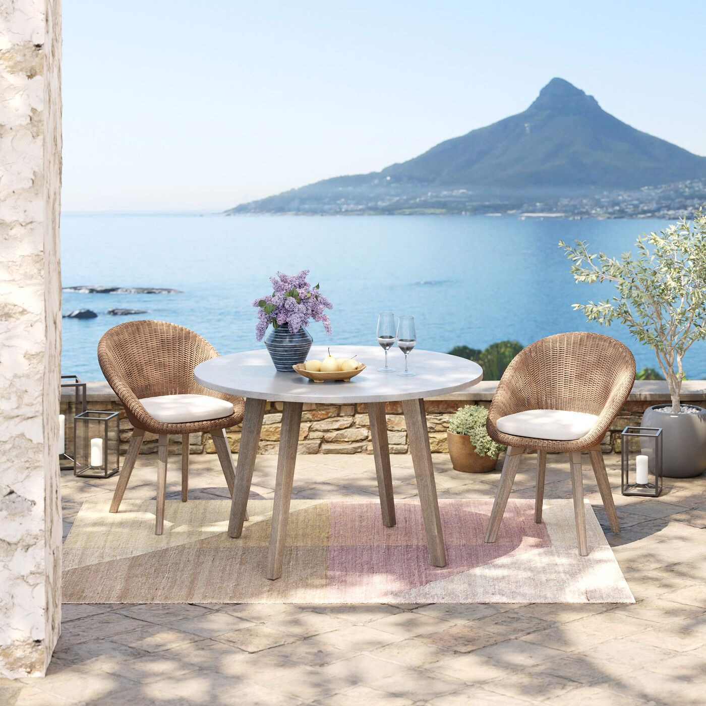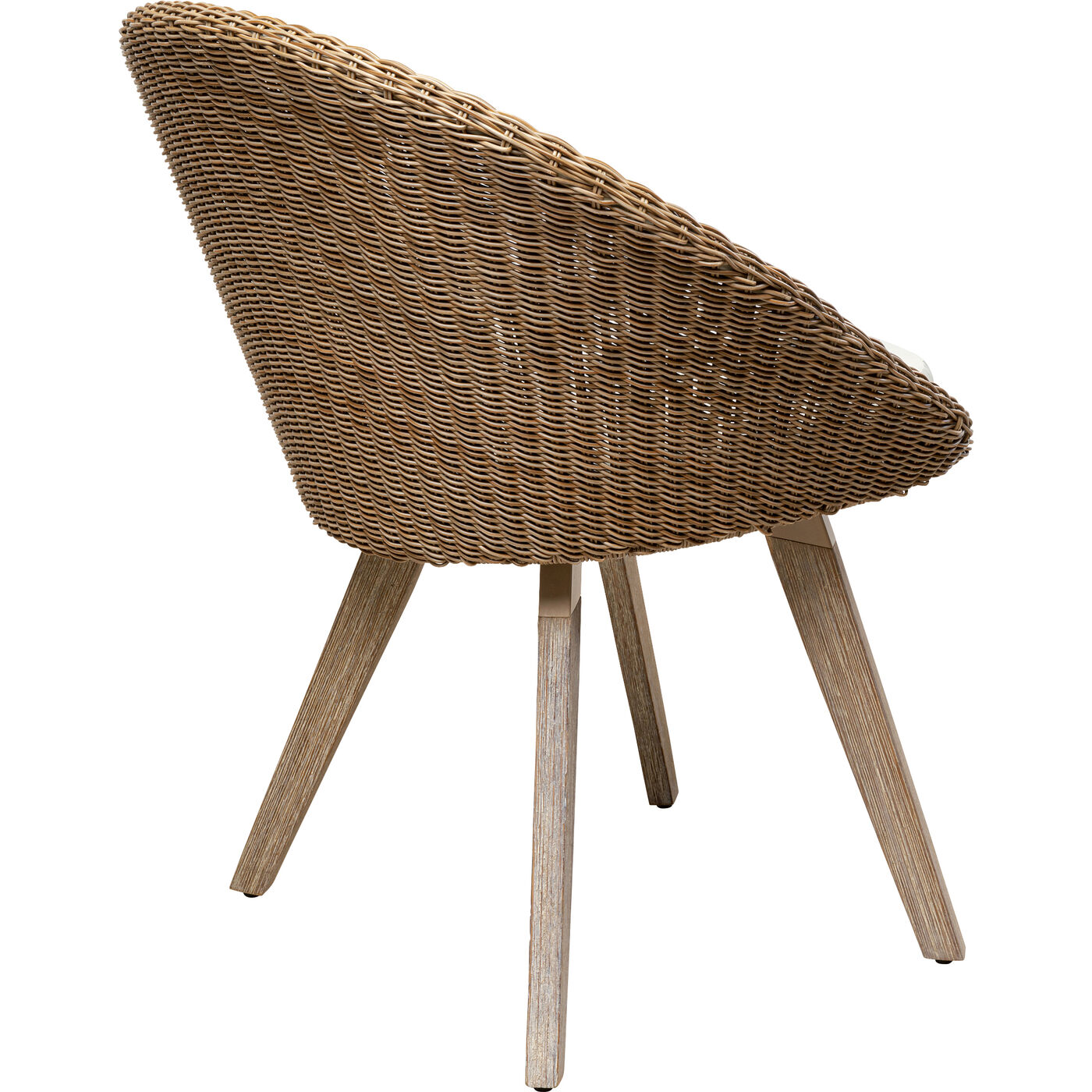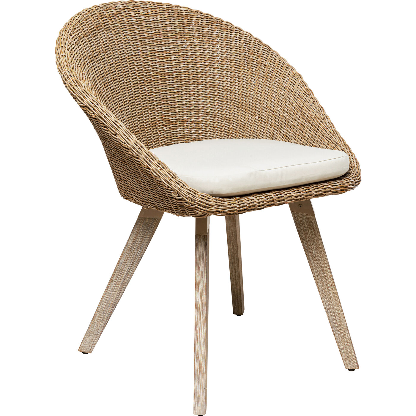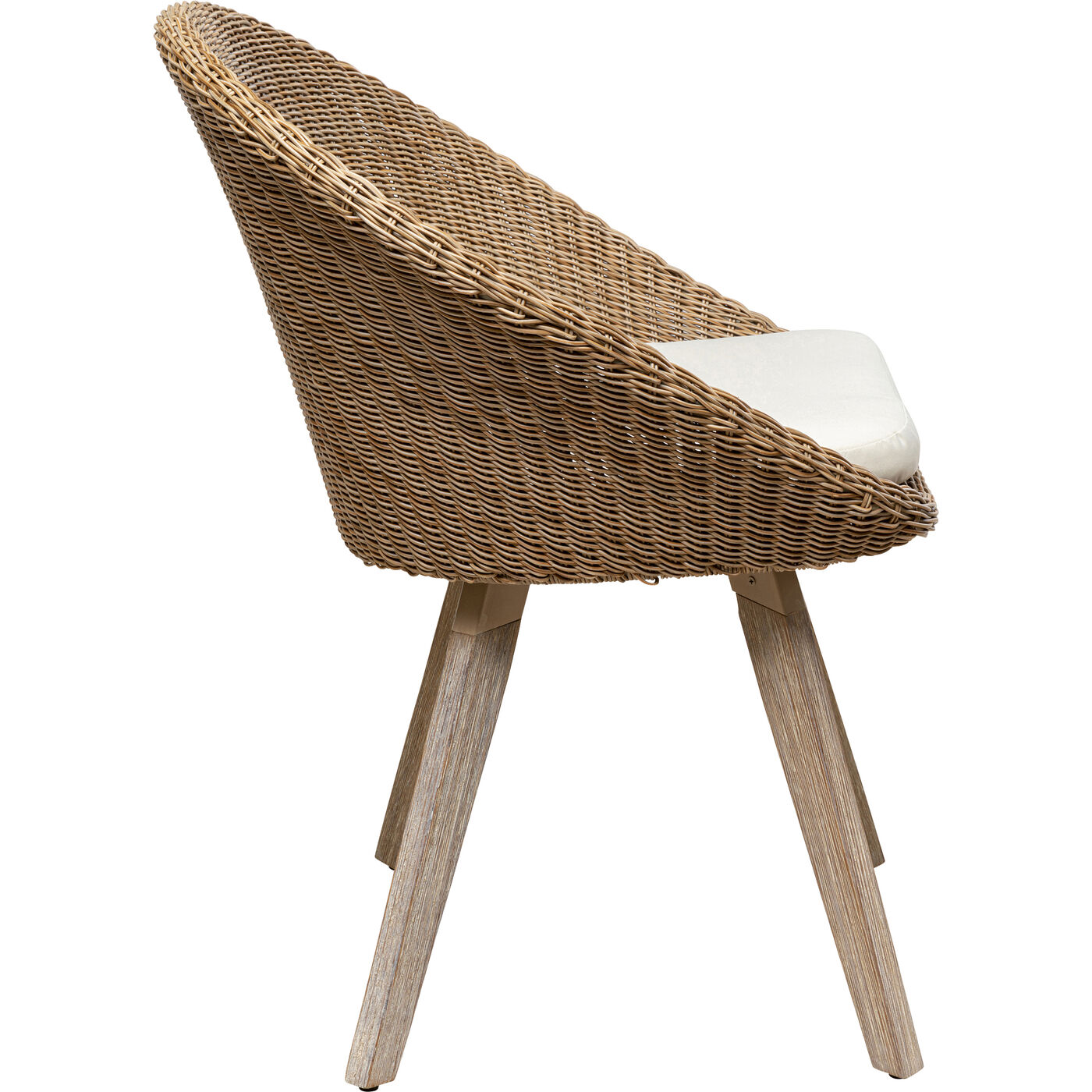 With this modern armchair, you will be investing in high-quality materials and a design that will outlast trends. Our chair for balconies, patios and gardens is designed to be a centrepiece indoors too, for example at the dining table. The rattan weave highlights the natural furnishing style. The acacia wood used for the legs is particularly robust, ensuring the longevity of this outdoor chair.