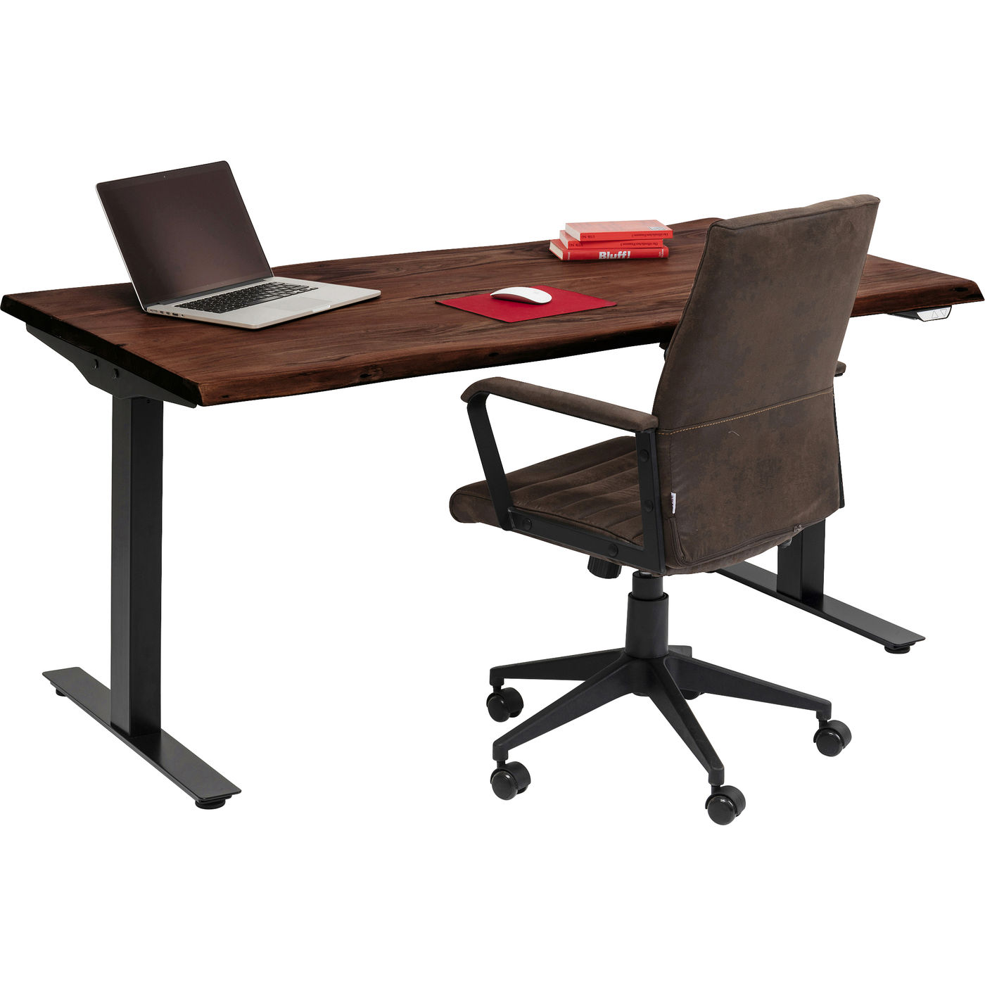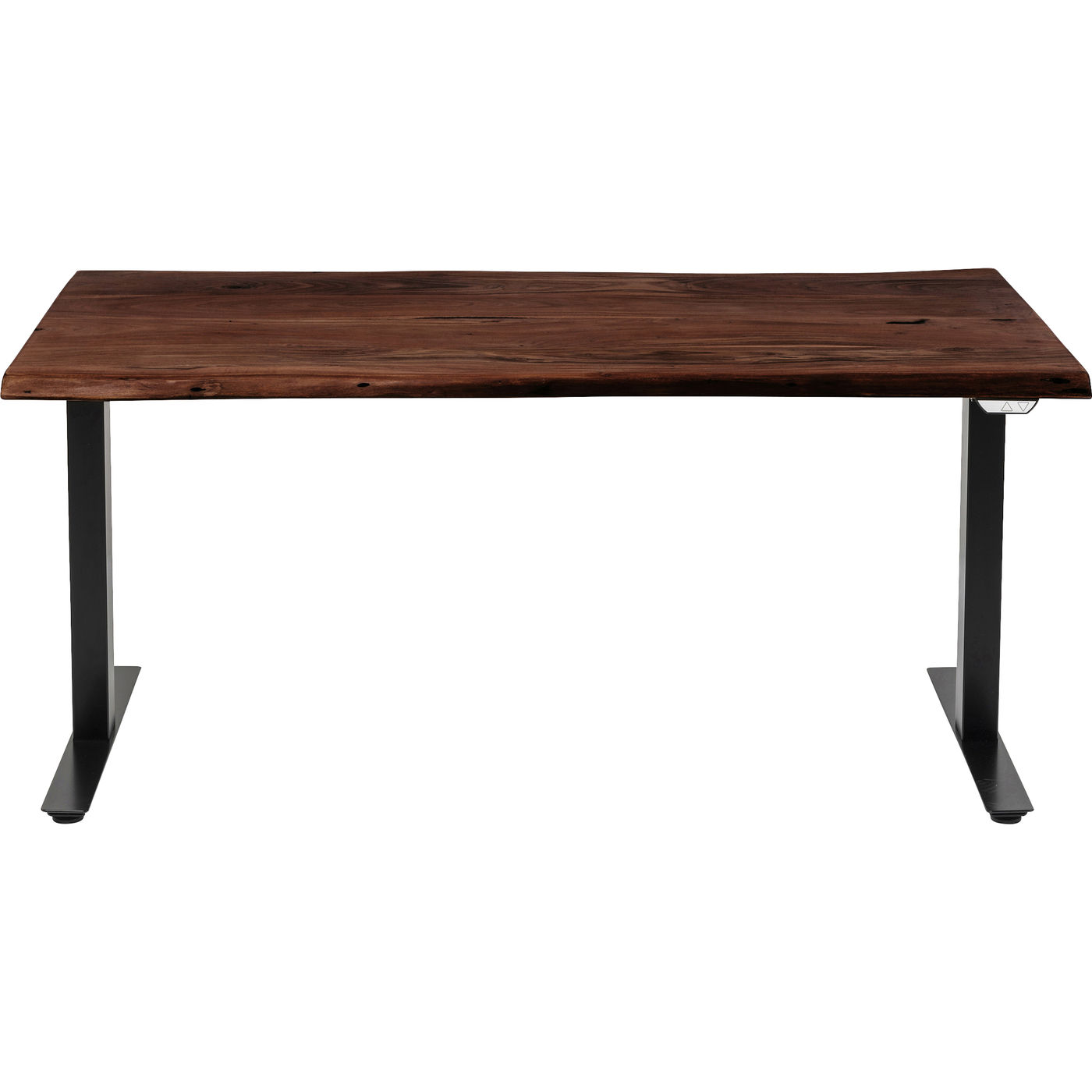 - Height-adjustable desk with dark solid wood top, 76 x 160 x 80 centimeters (H/W/D)