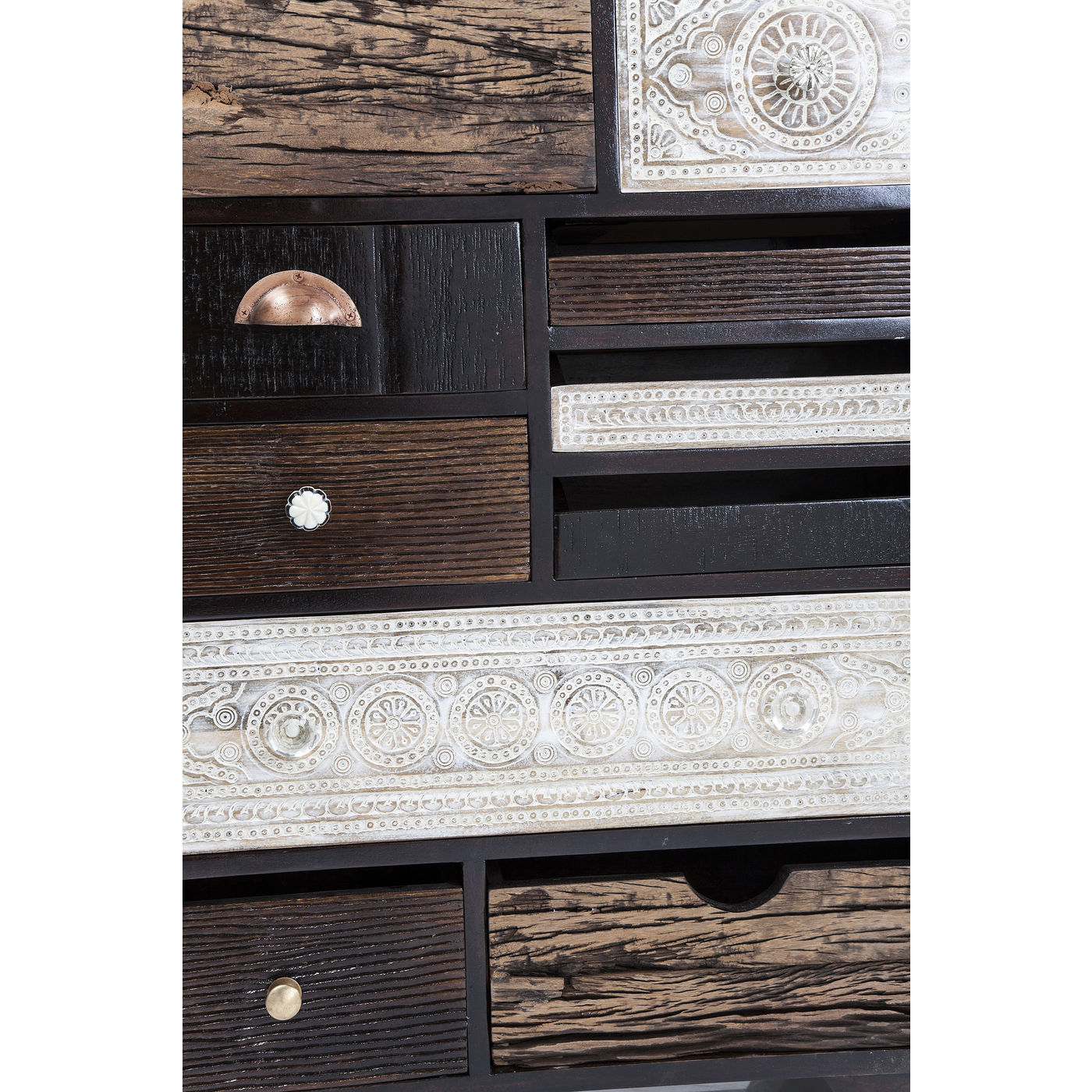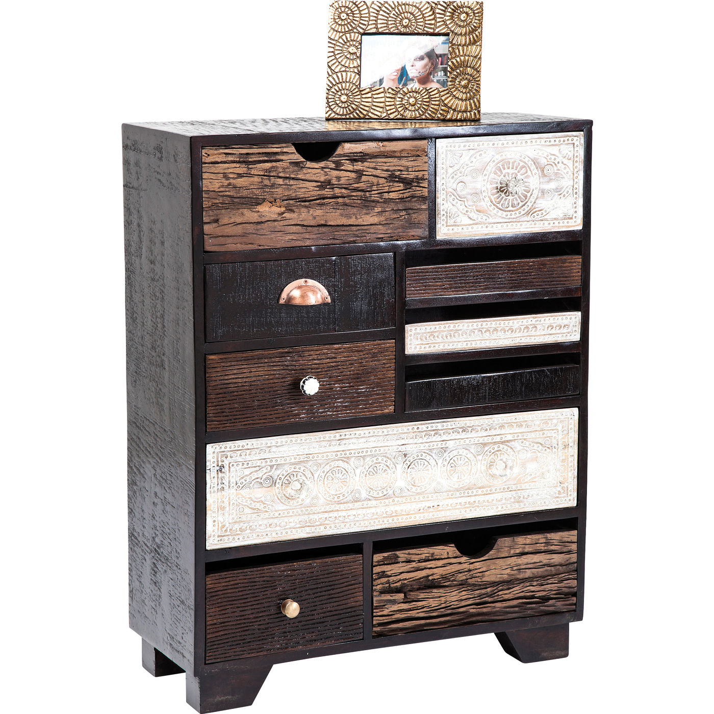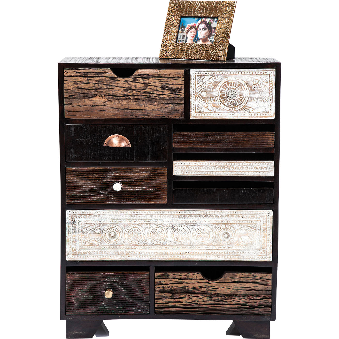 Romantic and modern -When they created this charming and irresistible furniture series our designers were inspired by the charm of southern lands and their carefree lifestyle. Ornamental patterns, original wood grain and the colours of the beautifully designed fronts give this dresser its charm. Its frame consists of mango wood painted in a dark shade and featuring clean, modern lines which provide a harmonious contrast for the 10 carved and individually designed drawers. In addition to the individual design the various sizes and positioning of the doors create a fascinating and harmonious look, which is enhanced by the reduced and subtle warm colours. Furniture in the Finca series brings that holiday feeling into the home. Every piece is individual and unique.