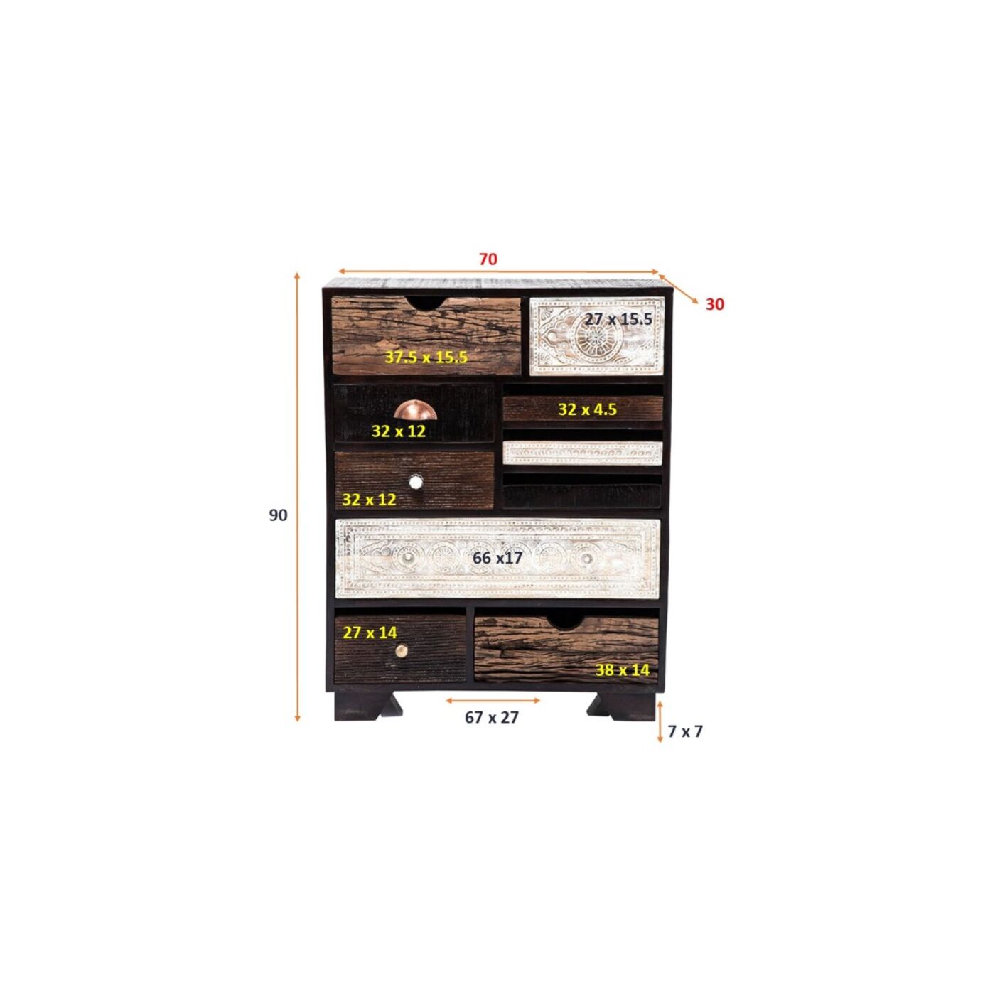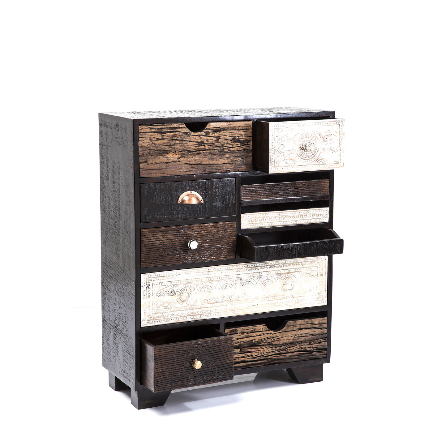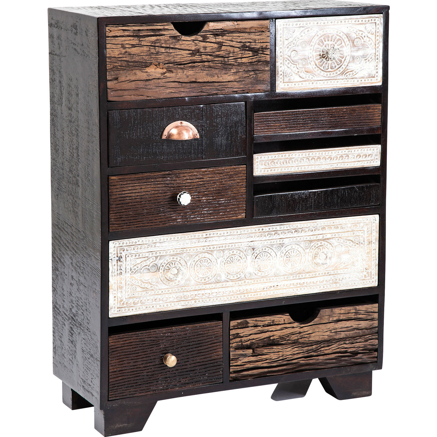 Romantic and modern -When they created this charming and irresistible furniture series our designers were inspired by the charm of southern lands and their carefree lifestyle. Ornamental patterns, original wood grain and the colours of the beautifully designed fronts give this dresser its charm. Its frame consists of mango wood painted in a dark shade and featuring clean, modern lines which provide a harmonious contrast for the 10 carved and individually designed drawers. In addition to the individual design the various sizes and positioning of the doors create a fascinating and harmonious look, which is enhanced by the reduced and subtle warm colours. Furniture in the Finca series brings that holiday feeling into the home. Every piece is individual and unique.
