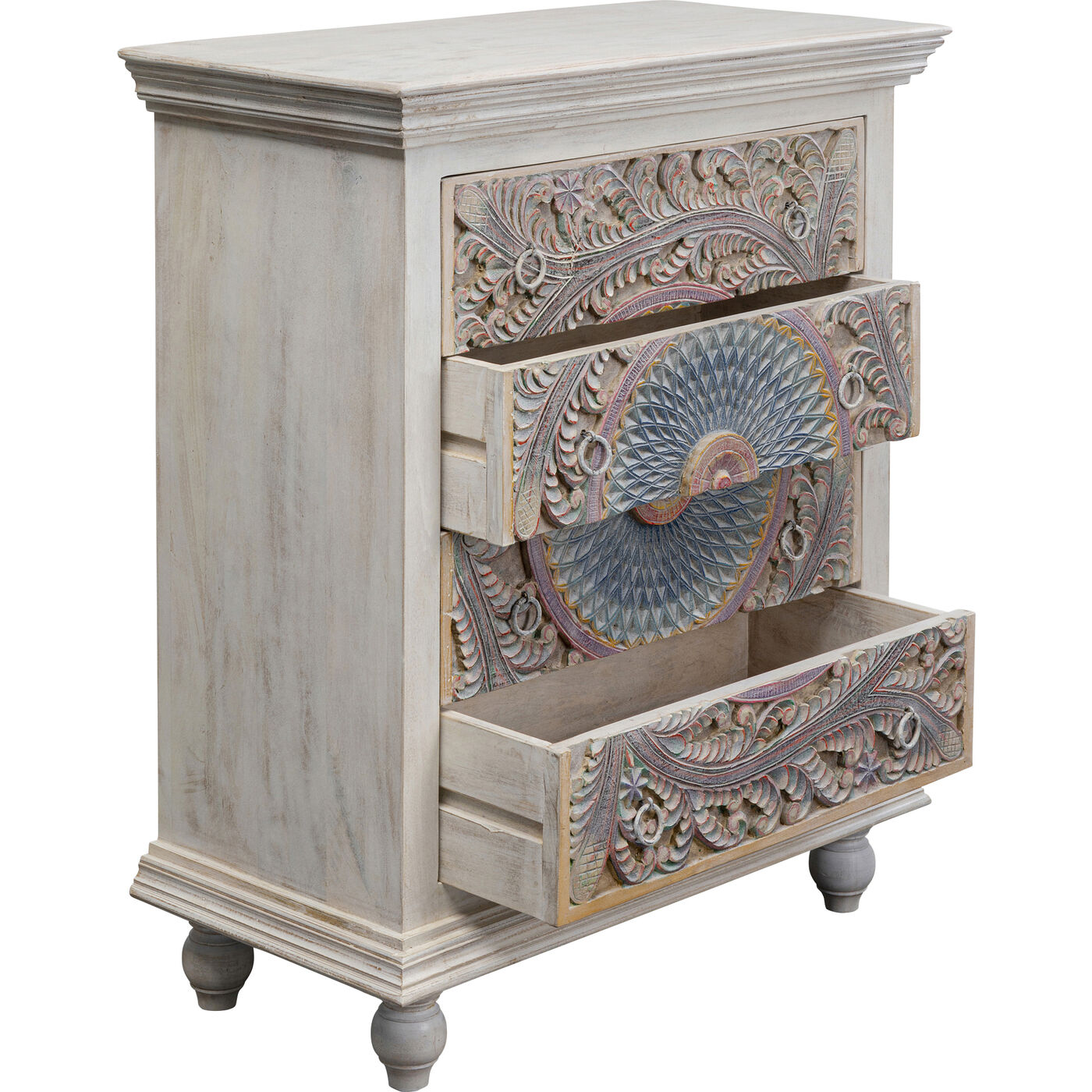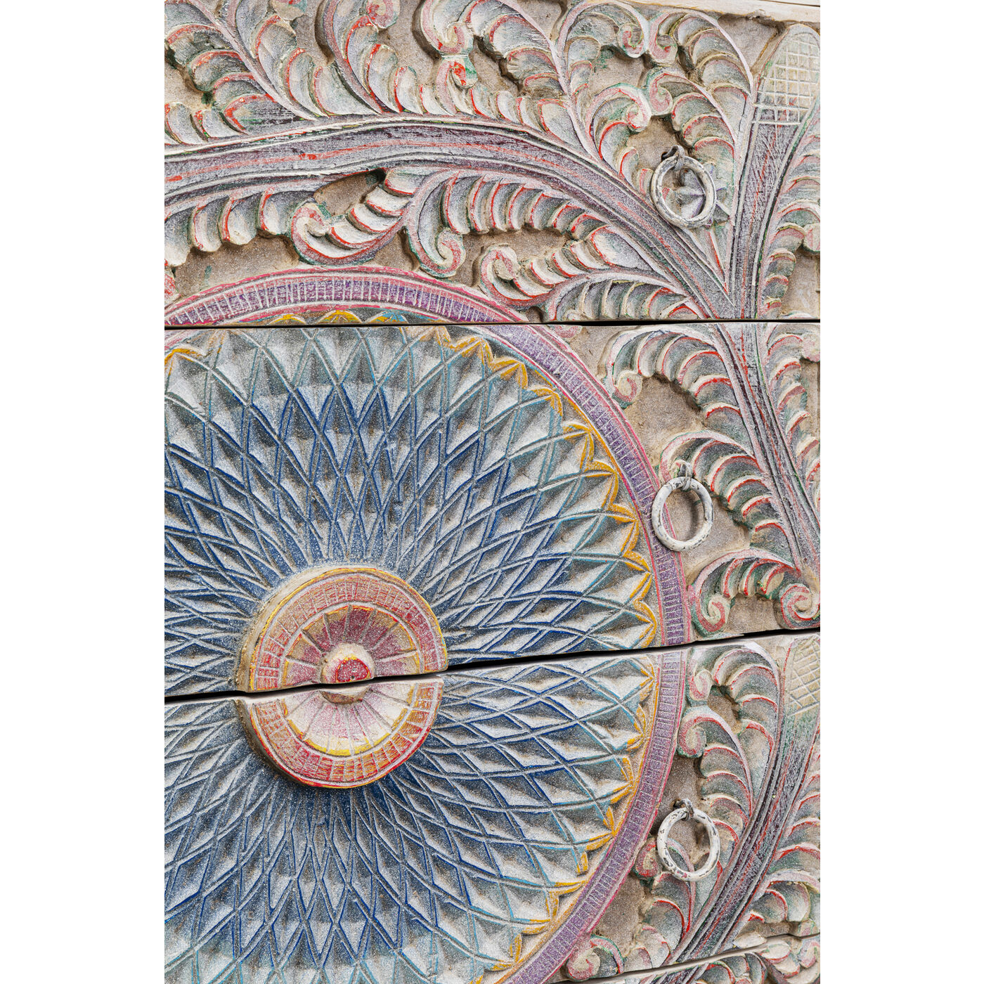 - The elaborately carved fronts feature pastel colours such as blue, pink and purple
