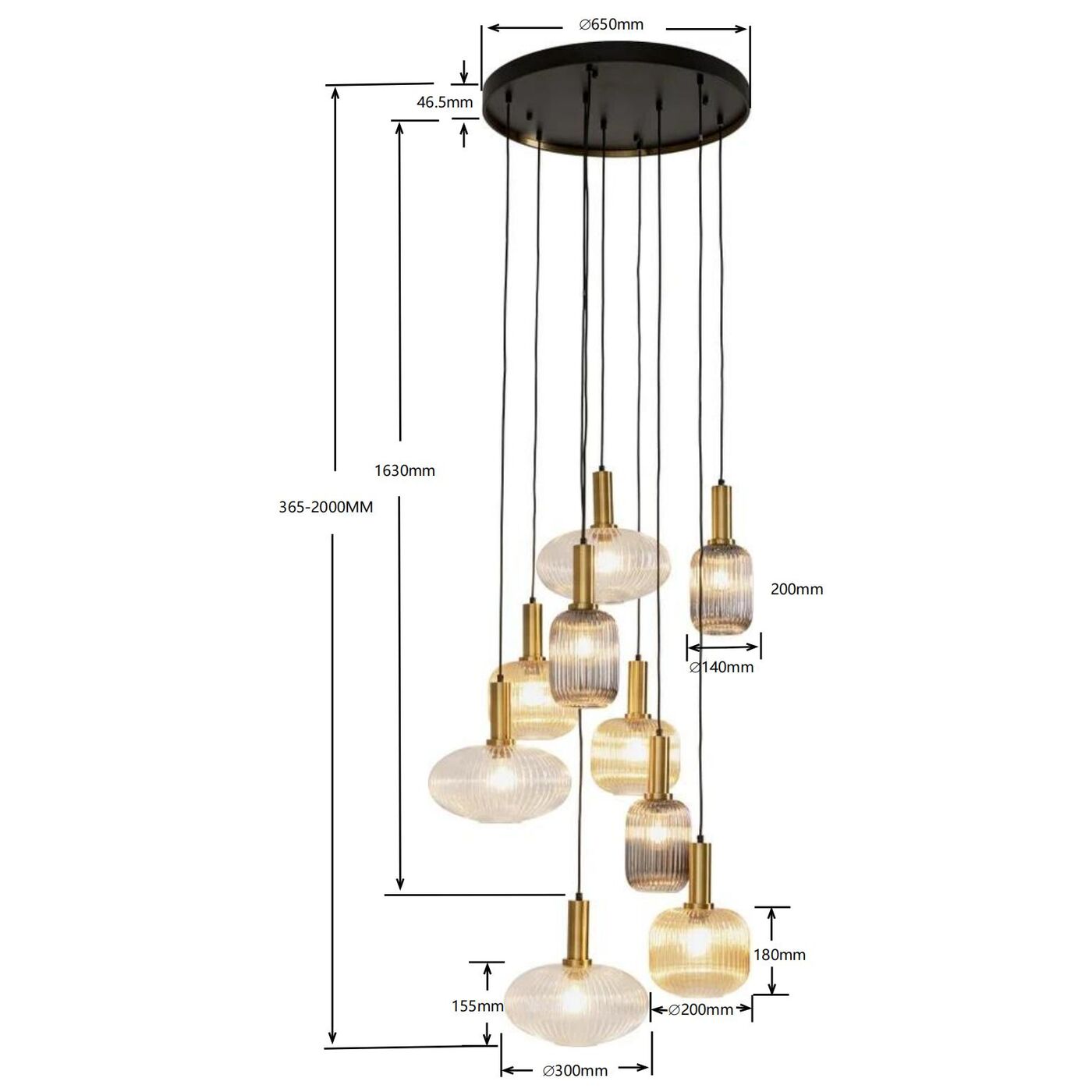 - Elegant and high quality hanging lamp in gold and beige with nine shades, 200 x 80 x 80 centimeters (h/w/d)