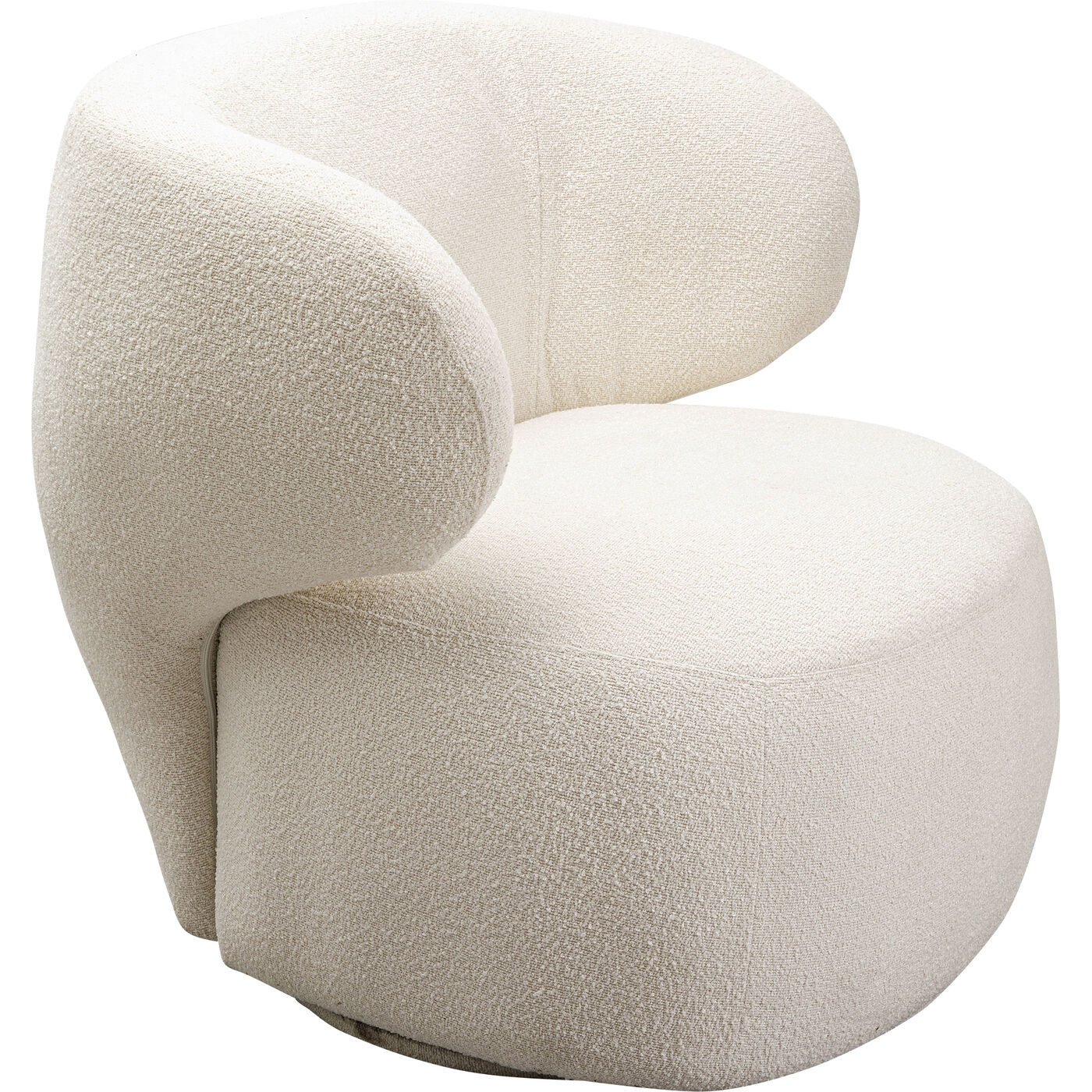 Elegance meets comfort at a stylish level: with its curved shape and cream-colored bouclé cover, this swivel armchair brings subtle luxury vibes to any interior. The swivel function ensures flexible perspectives, while the soft upholstery guarantees relaxed seating comfort - perfect for cozy reading corners, as a lounge highlight in the living room or as an eye-catcher in the bedroom. Particularly effective in combination with gold-colored accents, light-colored carpets or other organically shaped pieces of furniture. A design object that combines functionality and aesthetics and exudes modern restraint with a touch of glamour.