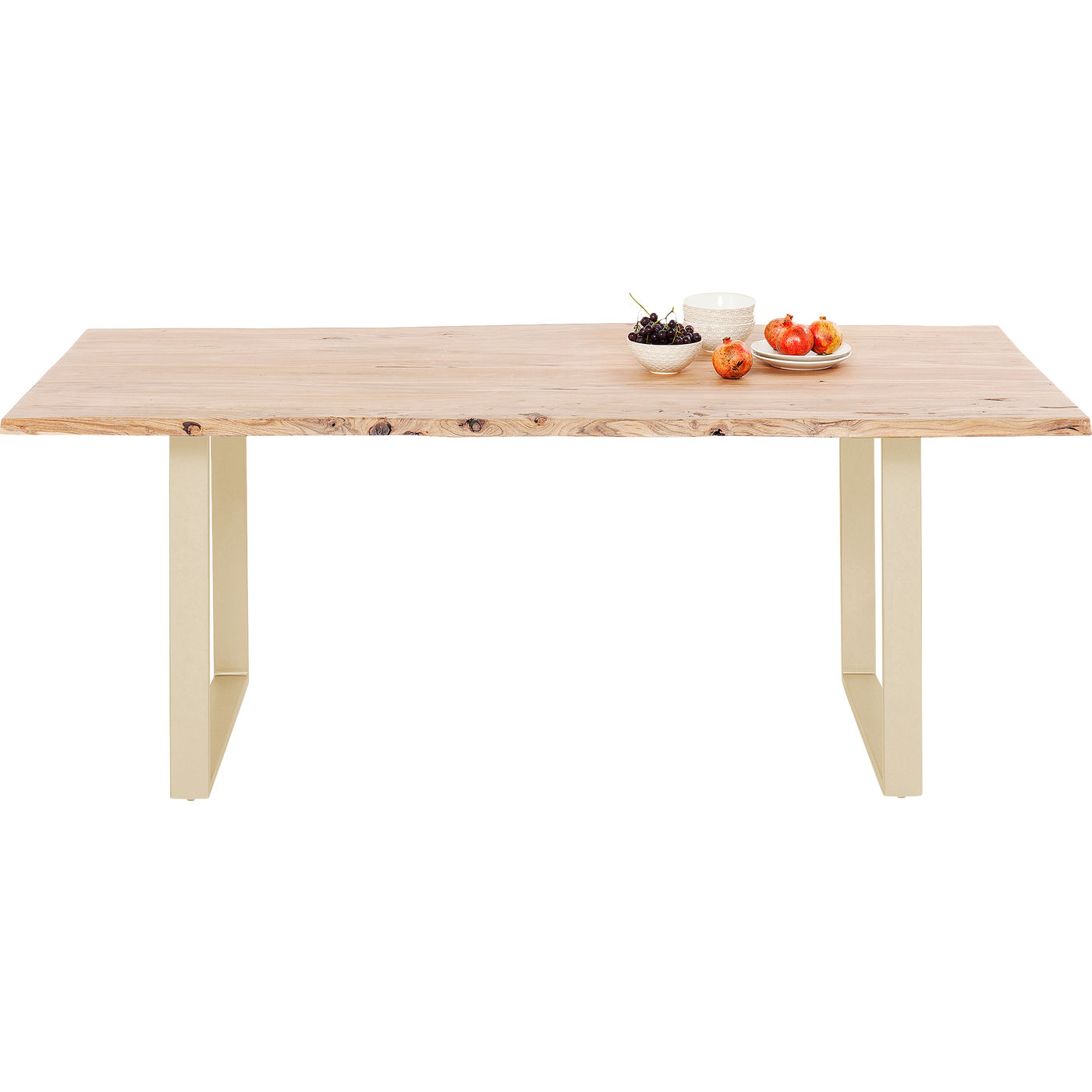 This spacious dining table combines natural flair with modern design. The solid wooden top with its striking grain brings warmth into the room, while the irregular edges emphasize the organic character of the natural material. The golden sled base adds a sophisticated accent and lends the table a stylish lightness. Whether in minimalist, elegant or industrial-inspired interiors - this table becomes a sociable focal point and offers space for cozy get-togethers with family and friends.