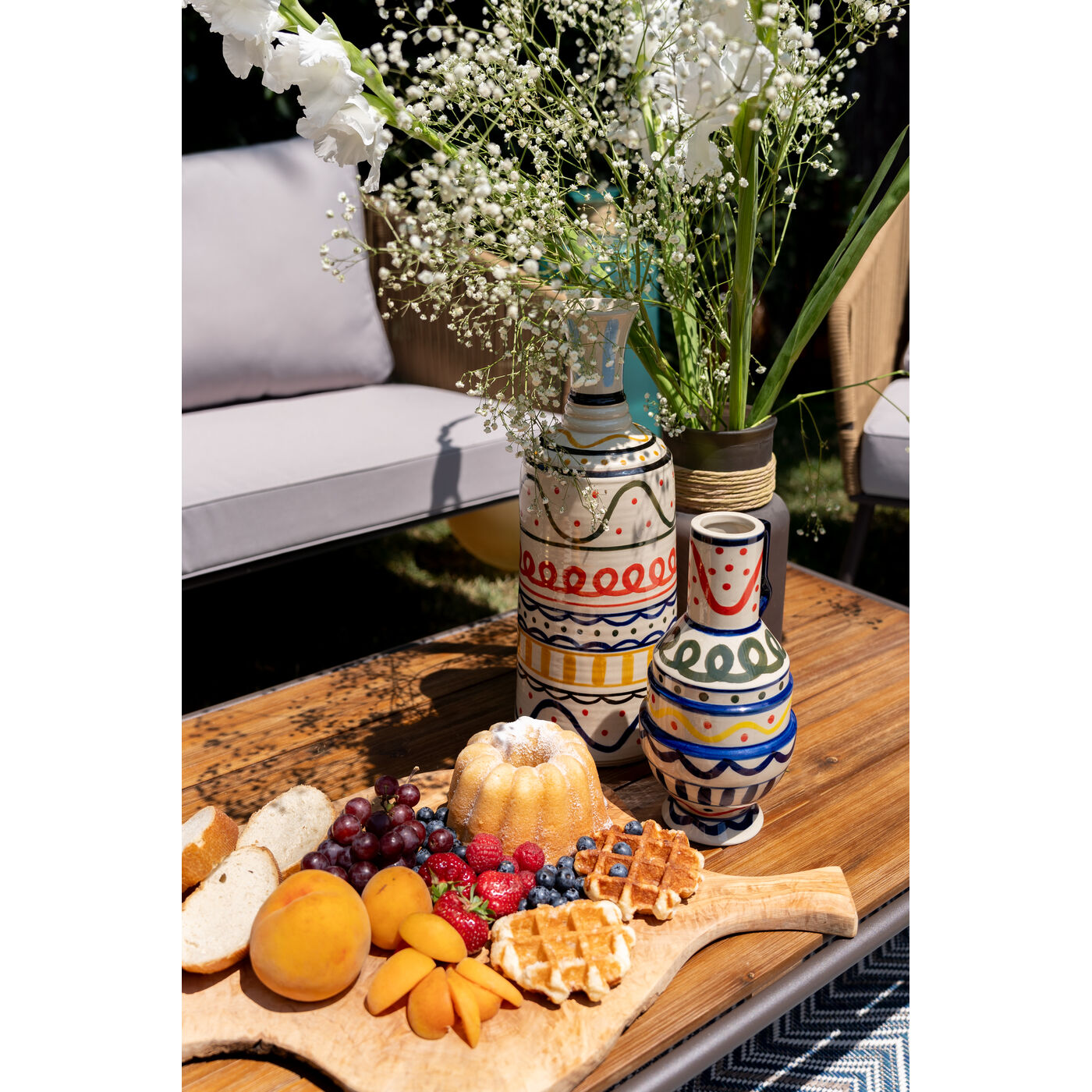 Colorful, patterned stoneware dinnerware embodies a fascinating decorative character. Discover our high quality Los Cabos series of plates, bowls, matching vases and jars. The vibrant patterns and colors tell stories of culture and craftsmanship, as all pieces in this series are handmade and hand-painted. On a beige background, bowls and plates feature patterns in blue, red and black. The stoneware material brings a slightly rustic and natural flair to your home. With stoneware tableware you can create original and inviting table decorations, which can be integrated into modern living as well as into a country house ambience. Due to the handmade production Los Cabos is not suitable for the microwave or dishwasher.