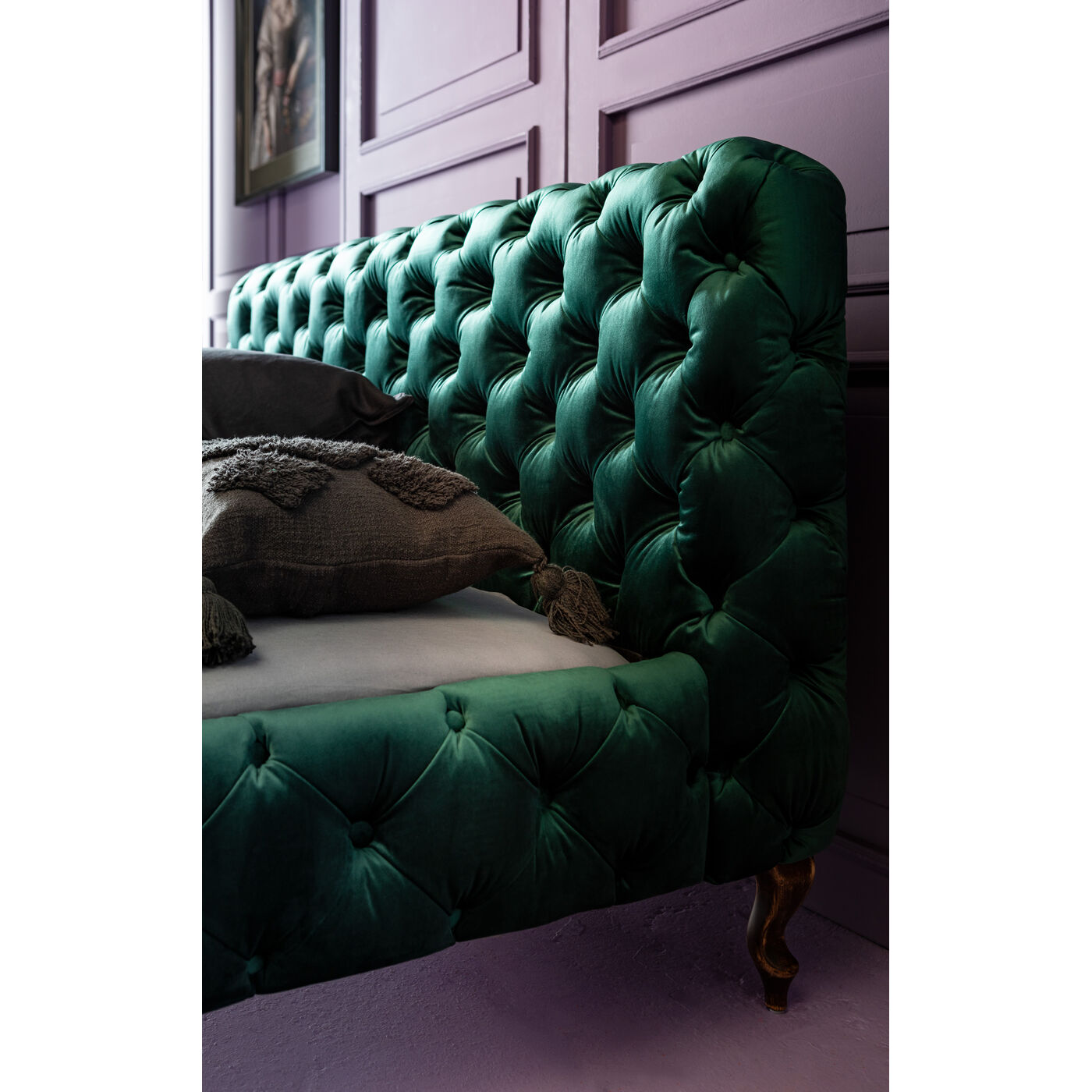 This bed from the collection Desire is inspired by the look of legendary Chesterfield furniture. This royally upholstered bed is also buttoned all around and on the high backrest. Together with the wonderfully generous reclining surface, this makes for a sensationally cosy place to sleep and relax. The velvet-look cover is in the modern trend colour of green and shimmers lighter and darker depending on the incidence of light. Matching slatted frames and mattresses are available in the KARE Online Shop and in the stores.