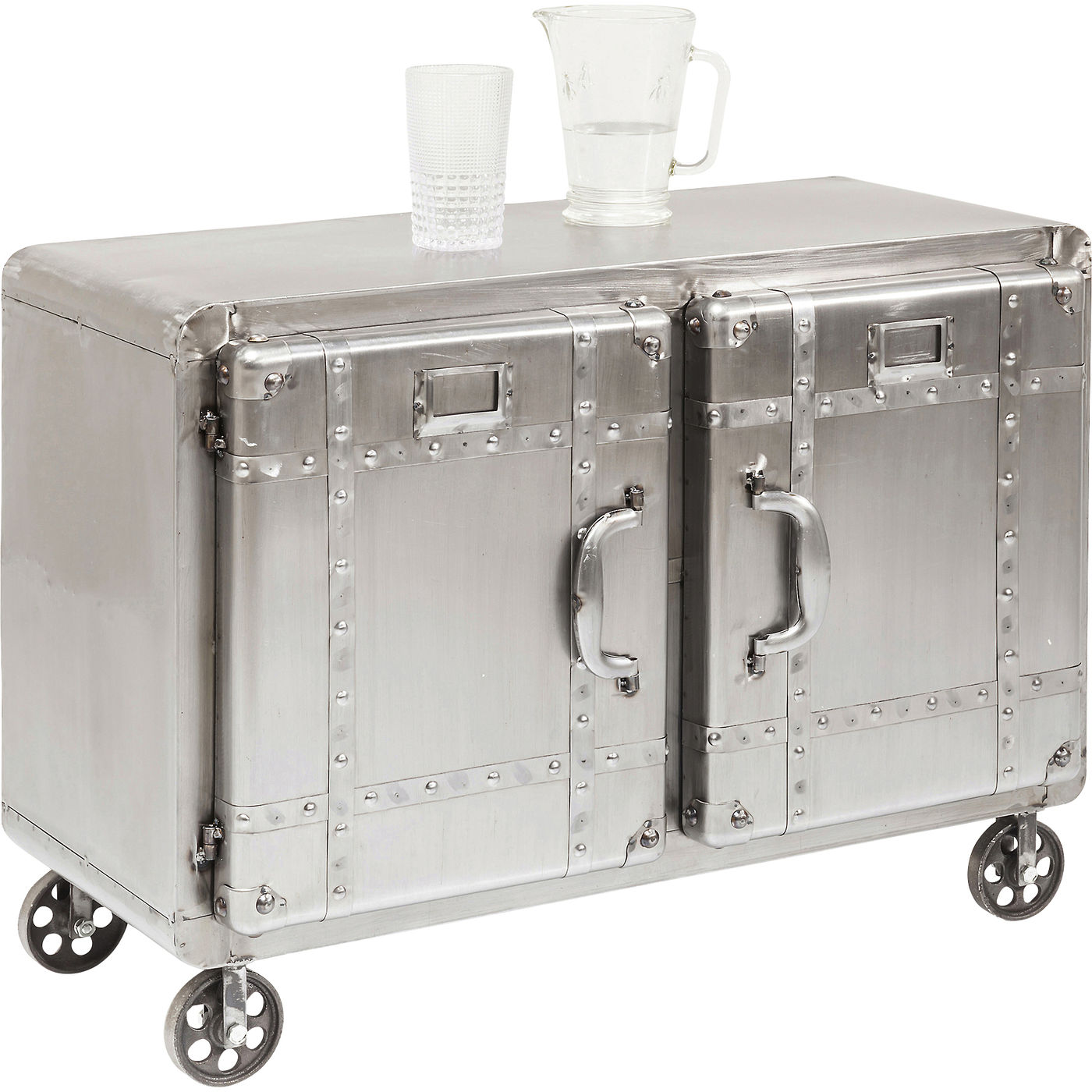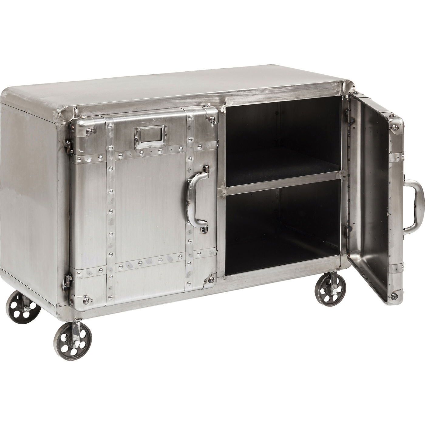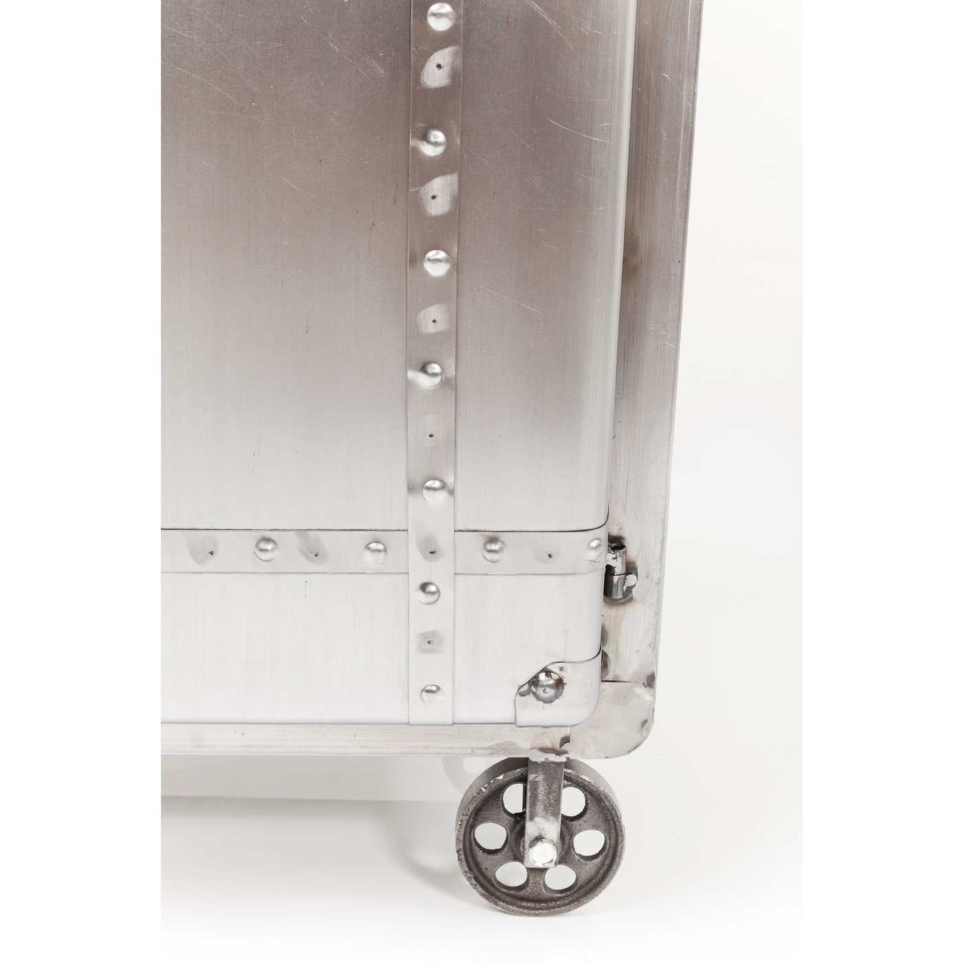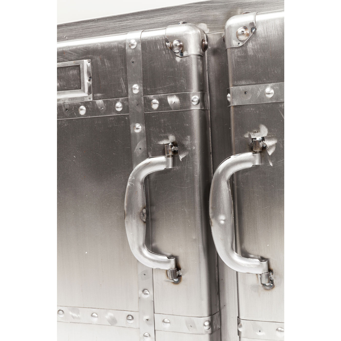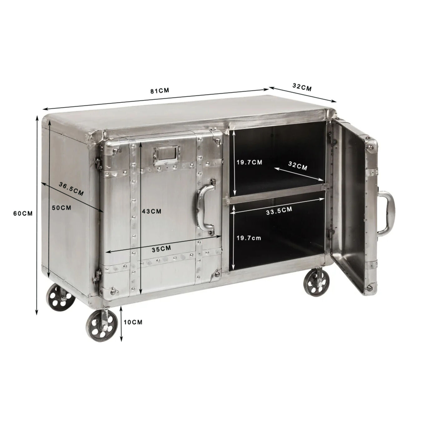 - Rechteckige, kompakte Kommode aus Stahl im Vintage-Look auf vier Rollen mit Schweißnähten und zwei großen Ablageflächen hinter den beiden Türen