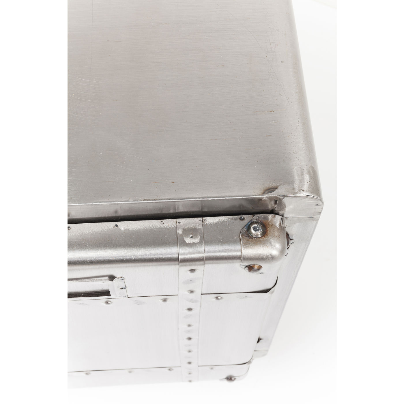 Markante Kommode aus Stahl im Raw-Industrial-Look, die mit charaktervollen und praktischen Details wie stilisierten Nieten, Griffen aus Metall, einer integrierten Uhr und Ablageflächen authentischen Industrial Flair versprüht. Wirkt besonders cool in einem modernen Interior!