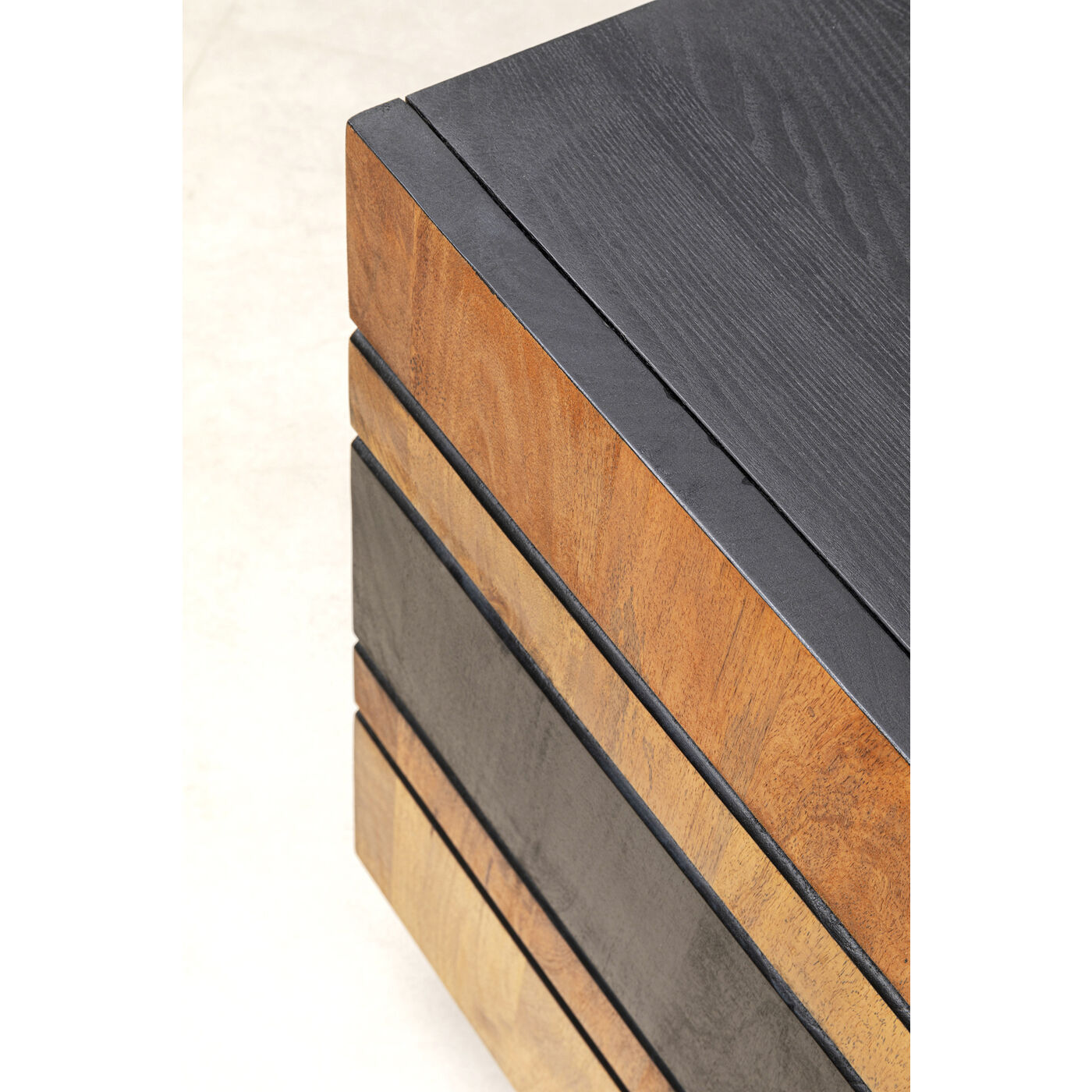Das handgefertigte Sideboard aus Holz ist eine Bereicherung für jedes Wohnzimmer. Das auffällige Frontdesign mit naturfarbenen und schwarz lackierten Partien verleiht dem Möbelstück einen wohnlichen und modernen Look. Das Sideboard bietet ausreichend Stauraum für Bücher, Geschirr oder Dekoration. Mit seiner hochwertigen Verarbeitung und individuellen Optik ist das Sideboard eine Investition, die sich langfristig auszahlt.