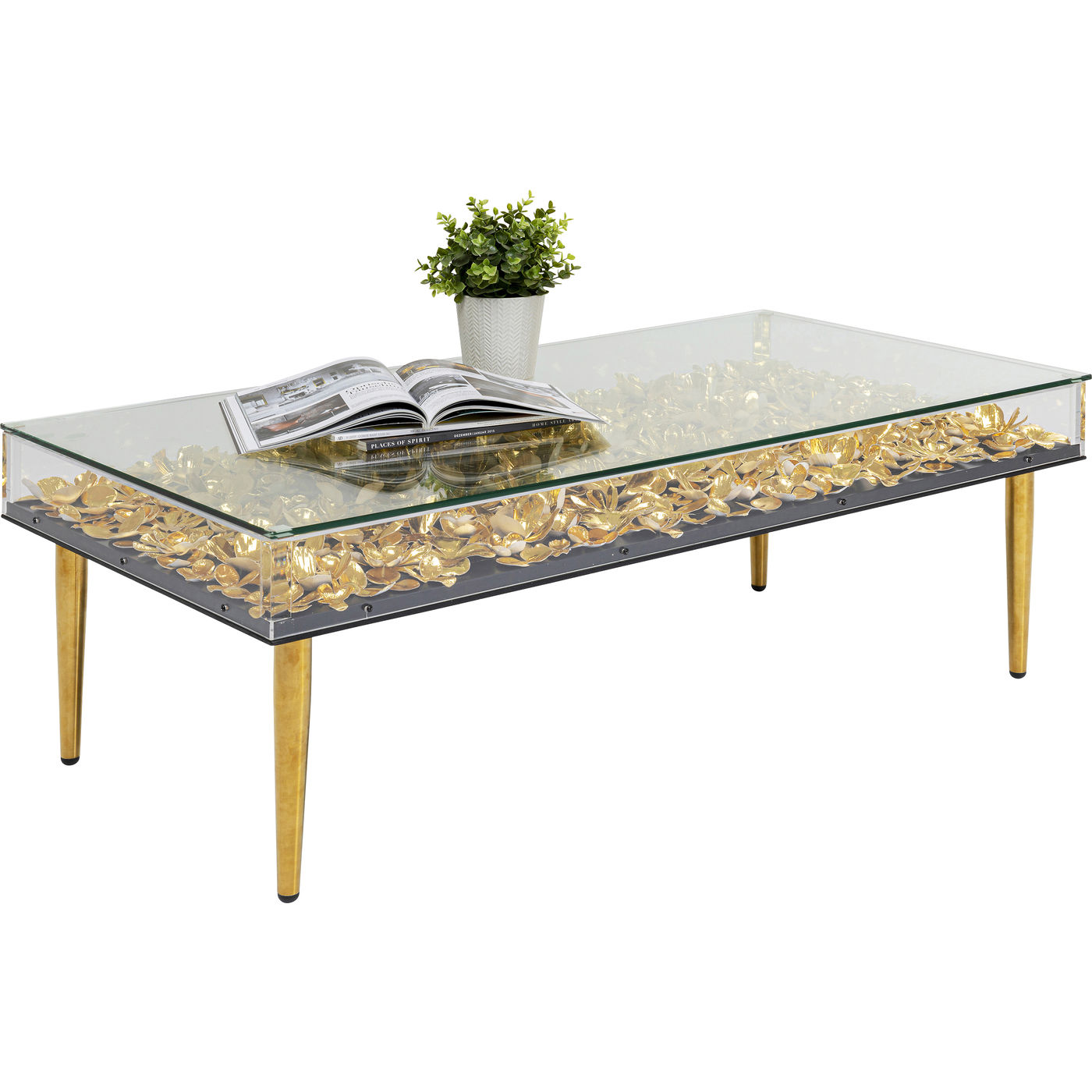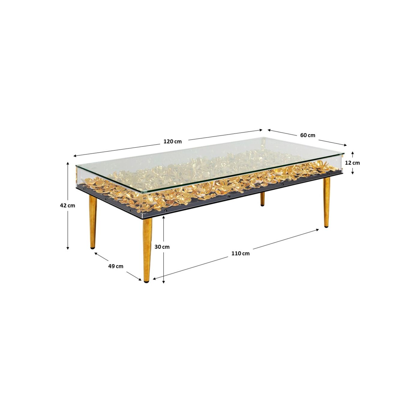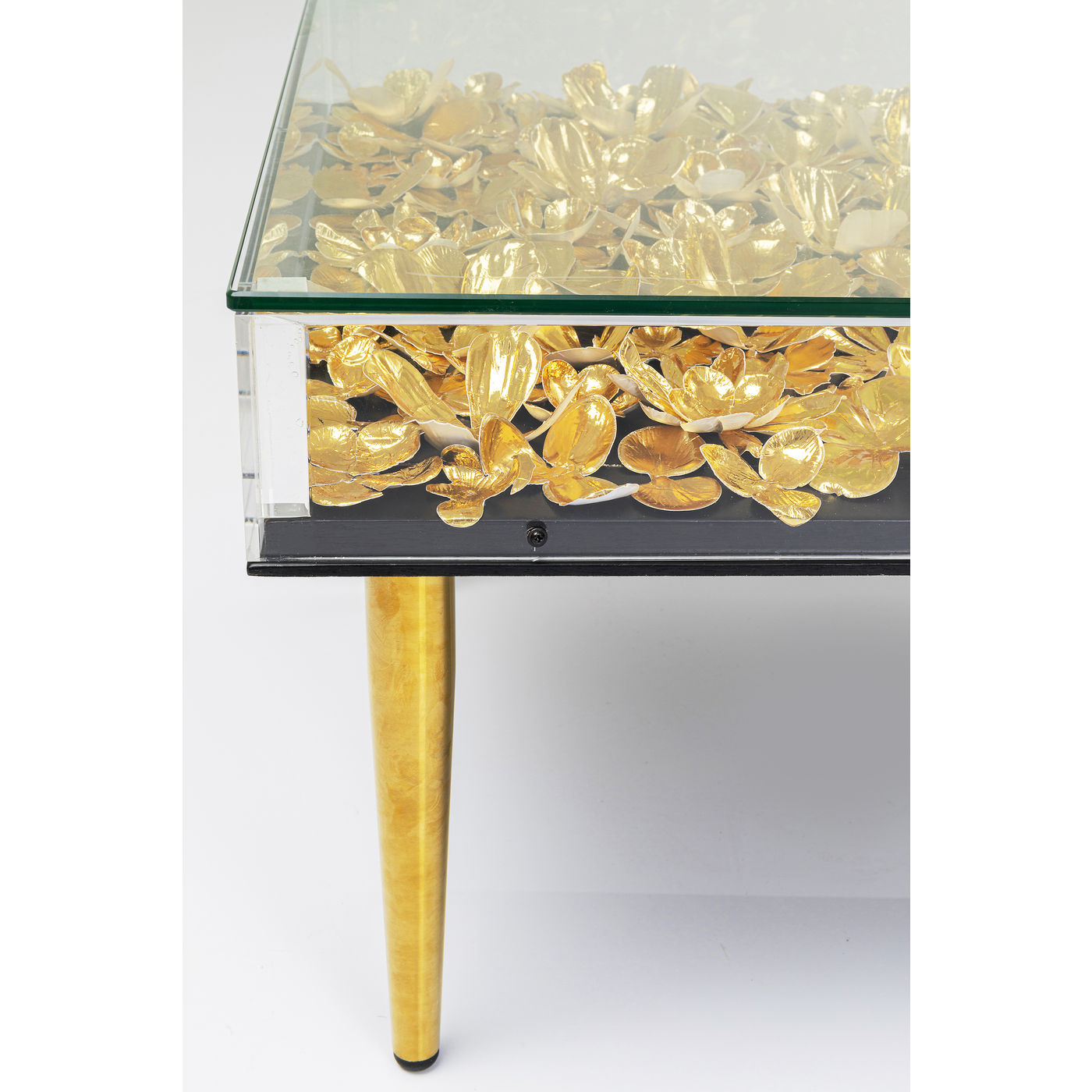 Ein dreidimensionales Kunstwerk für Blumenfans: Der Plexiglasrahmen mit goldenen Blüten übernimmt die Rolle einer außergewöhnlichen Tischplatte und wird zum Statement-Piece im Raum. Die Blüten wirken natürlich und frisch wie eine Sommerwiese, der Goldglanz gibt ihnen einen glamourösen und modernen Touch.