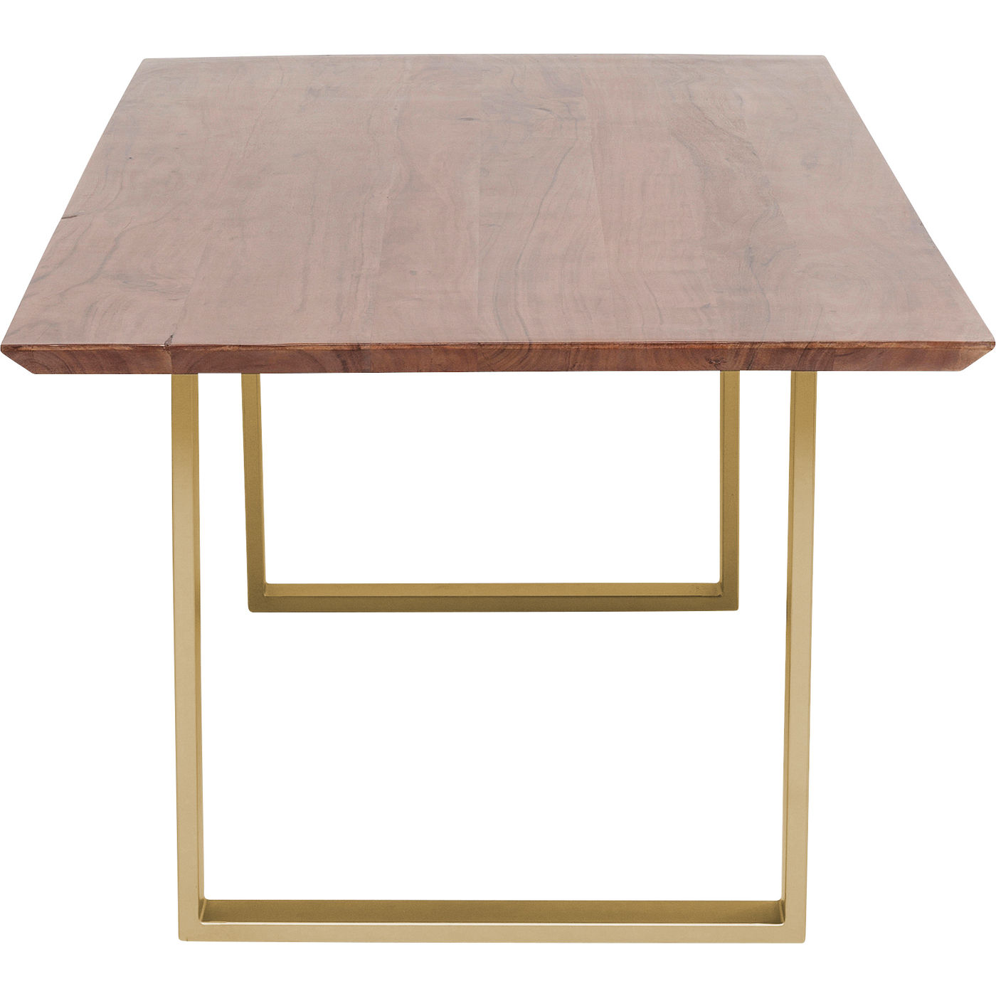 Dieser großzügige Esstisch kombiniert natürliches Flair mit modernem Design. Die massive Holzplatte mit markanter Maserung bringt Wärme in den Raum, während die unregelmäßigen Kanten den organischen Charakter des Naturmaterials unterstreichen. Das goldene Kufengestell setzt einen edlen Akzent und verleiht dem Tisch eine stilvolle Leichtigkeit. Ob in minimalistischen, eleganten oder Industrial-inspirierten Einrichtungen – dieser Tisch wird zum geselligen Mittelpunkt und bietet Platz für gemütliche Runden mit Familie und Freunden.