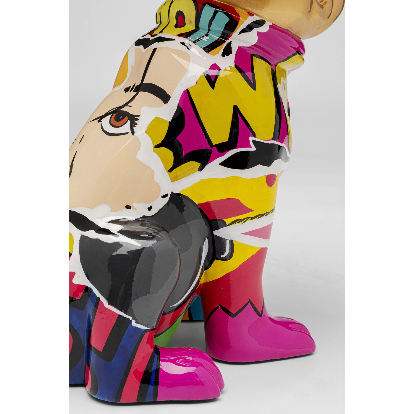 - Der stilisierte Hund mit lässiger Sonnenbrille und buntem Graffiti-Design dient hier als charmanter Lampenfuß