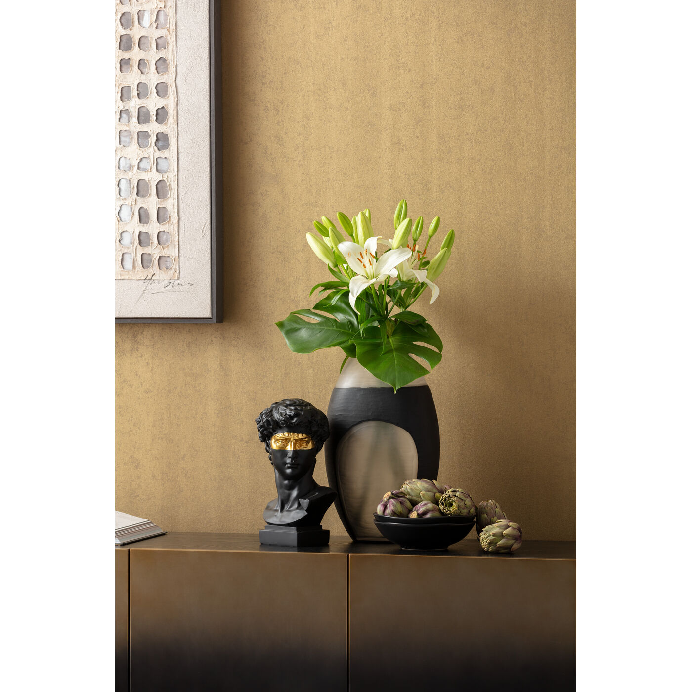 Kunstwerke und Wanddekorationen in den passenden Farbtönen können den Raum mit Mocha Mousse perfekt ergänzen. Wählen Sie Bilder oder Skulpturen, die die Farbe in den Mittelpunkt stellen oder sanft betonen.