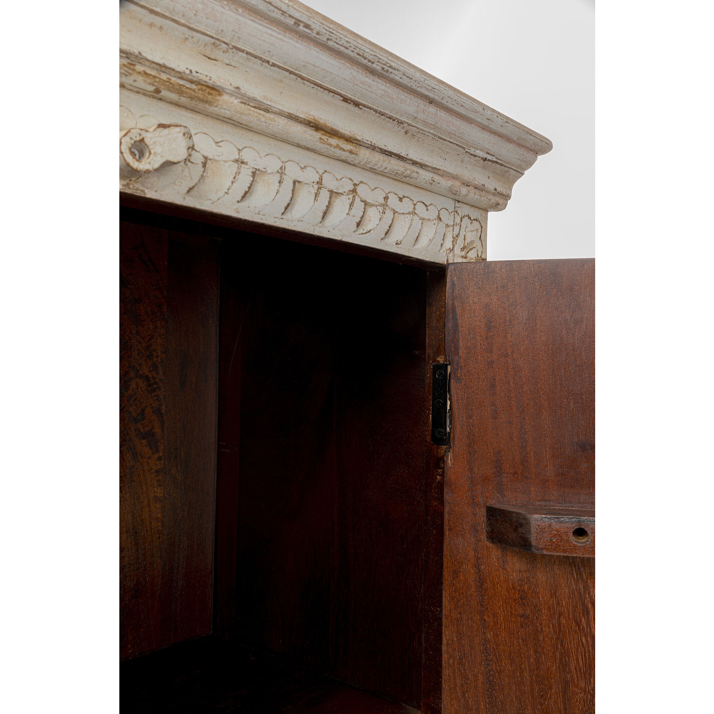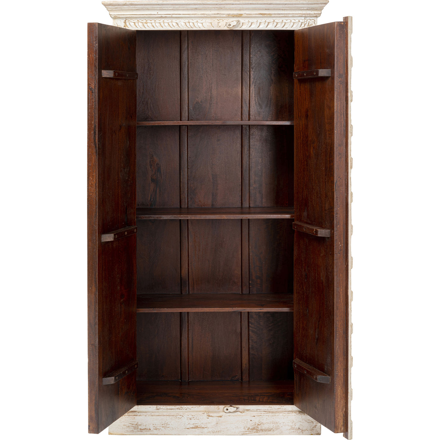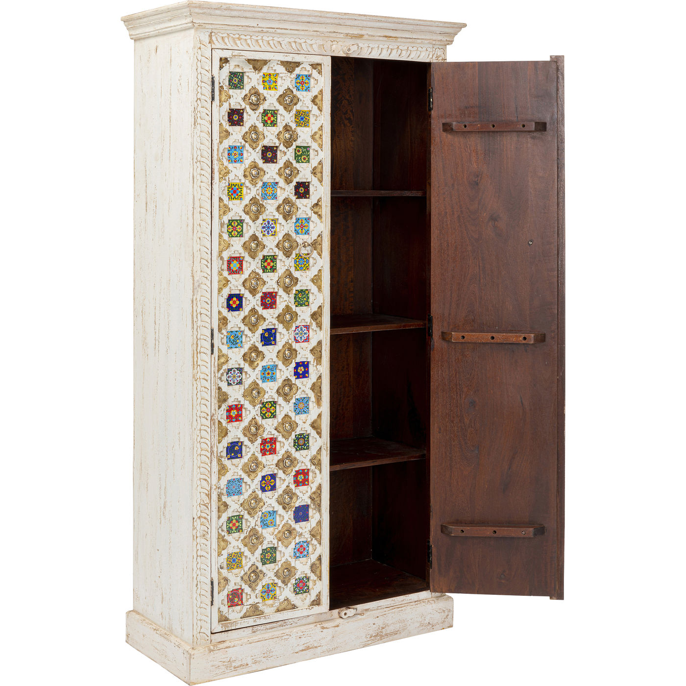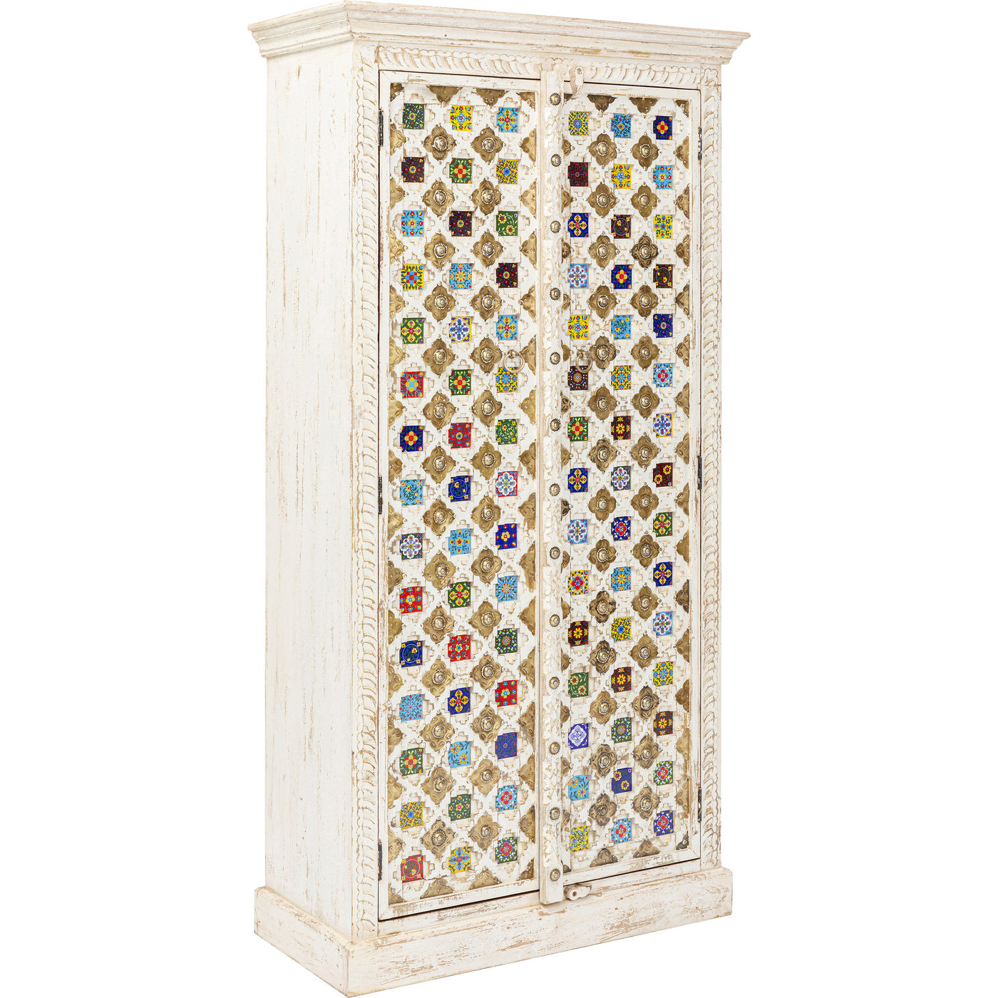 Un vero individualista, questo vero mobile in legno in stile antico con le sue numerose piastrelle colorate. Dietro le due grandi porte c'è un sacco di spazio di archiviazione, che rende questo armadio in legno così pratico. Soprattutto, però, questo pezzo unico in stile shabby-chic porta atmosfera nella stanza.