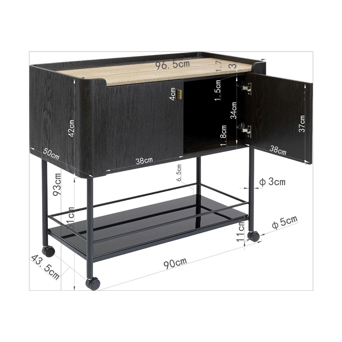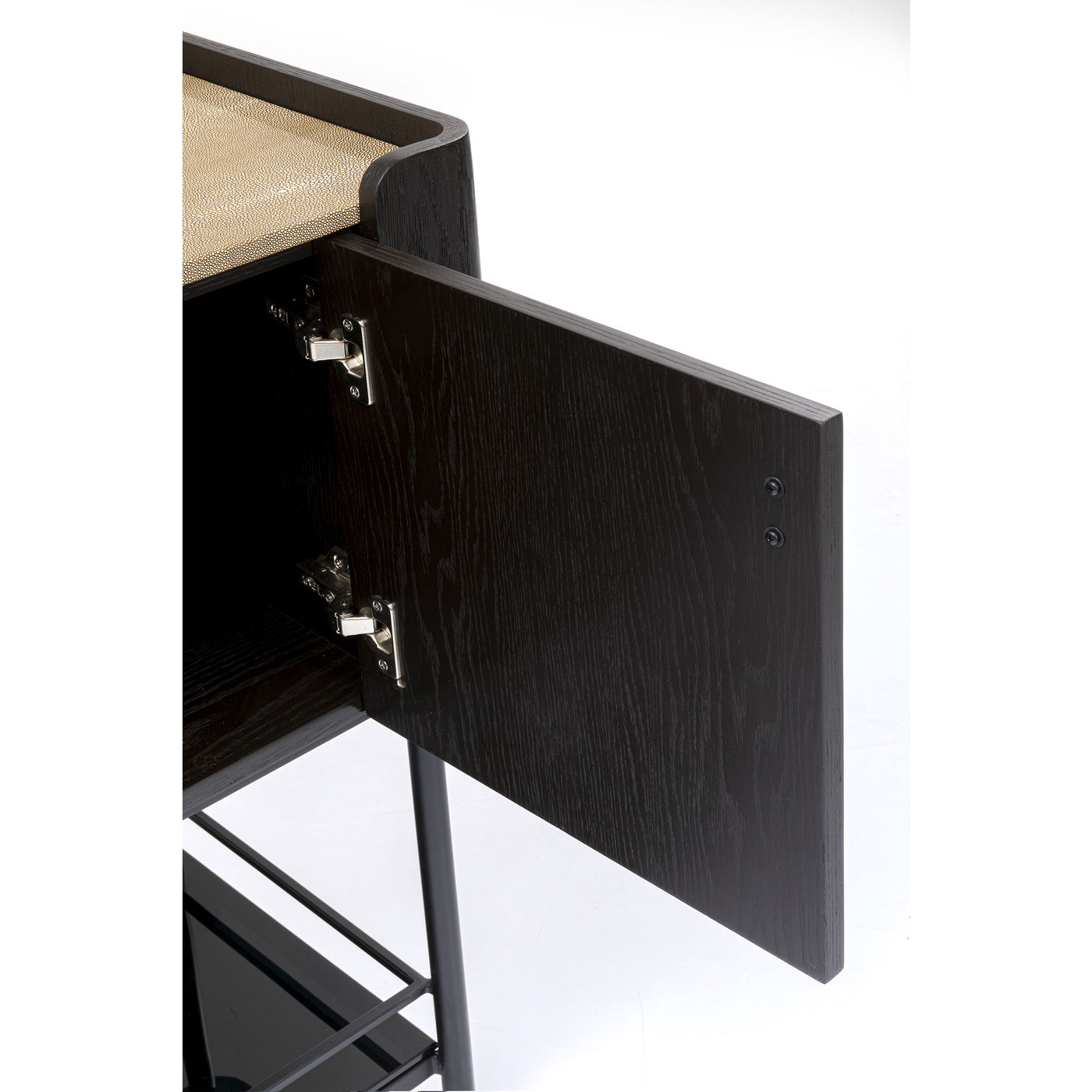 - Die Schönheit dieses Designermöbels kommt auch von innen. Hinter den Türen findet sich Stauraum und eine Hängevorrichtung für Stielgläser
