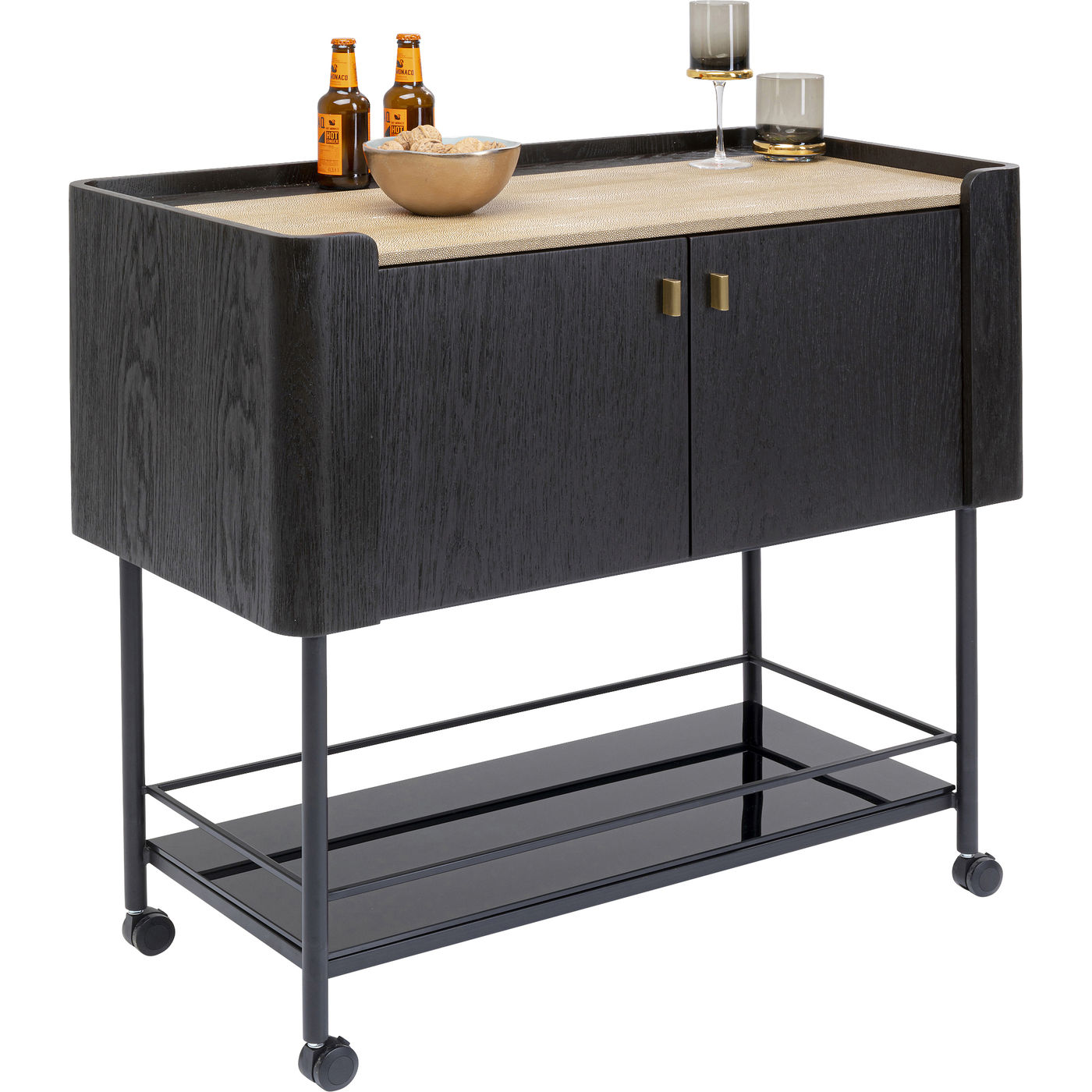 - Flüssige Schätze, Barutensilien und Gläser stehen auf dem Boden aus schwarz gefärbtem Glas jederzeit griffbereit
