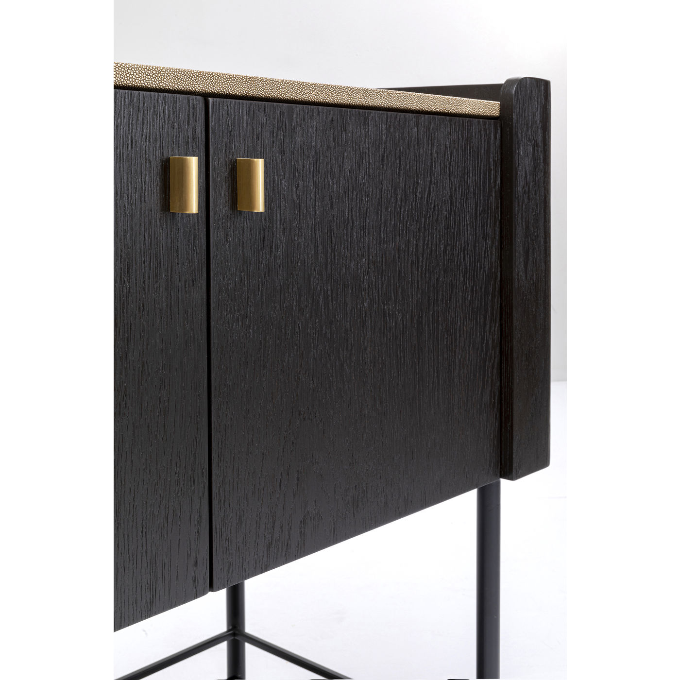 - Charaktervoll: die Verbindung von schwarz-braunem Eichenholz in massiv und furniert mit den cremefarbenen Bezügen in extravaganter Rochenhaut-Optik