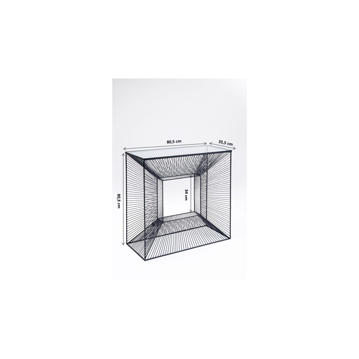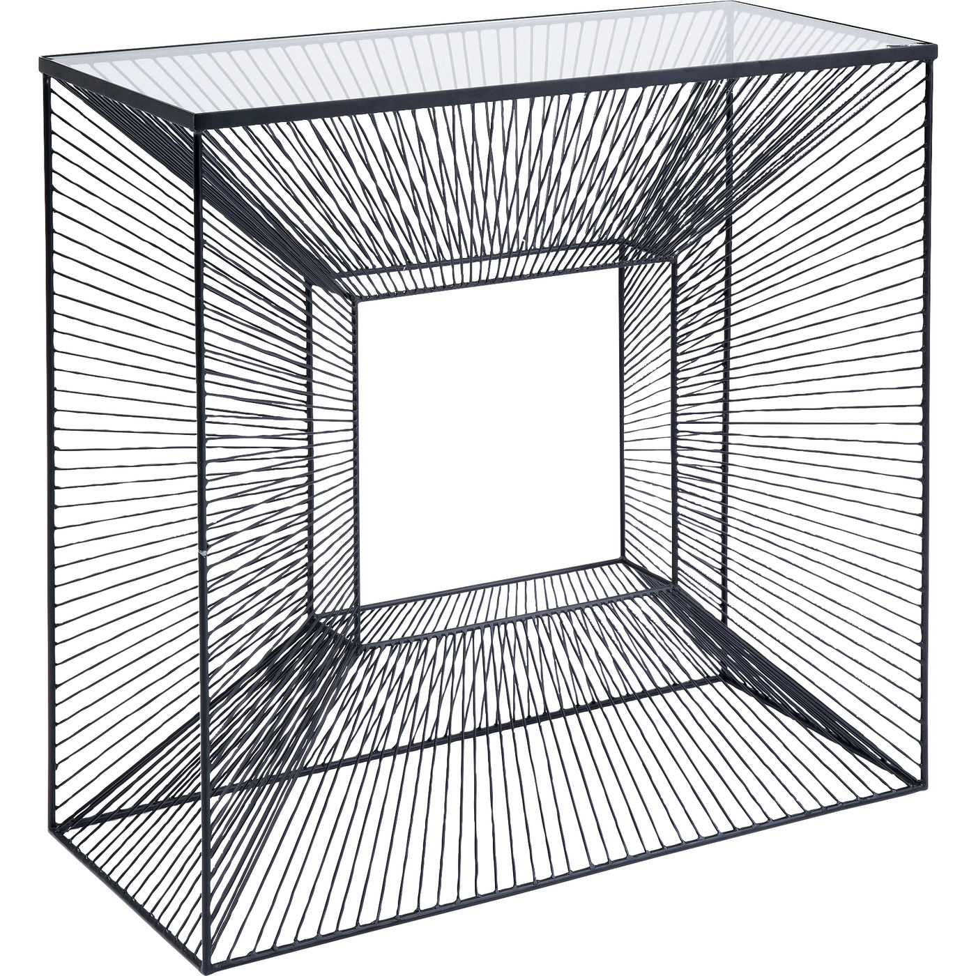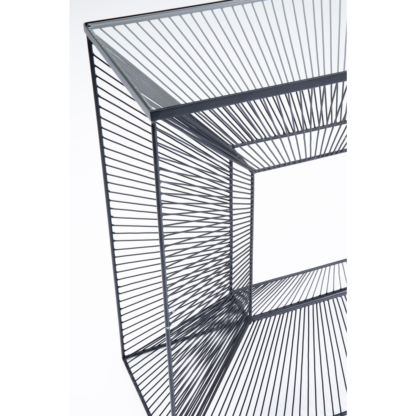 Questa consolle grafica ridotta con piano in vetro trasparente è un punto culminante del design: la struttura in filo d'acciaio fatta a mano offre fantastici effetti visivi e porta qualcosa di molto moderno in qualsiasi ambiente abitativo.