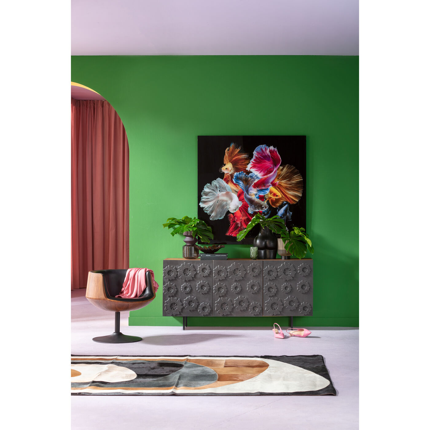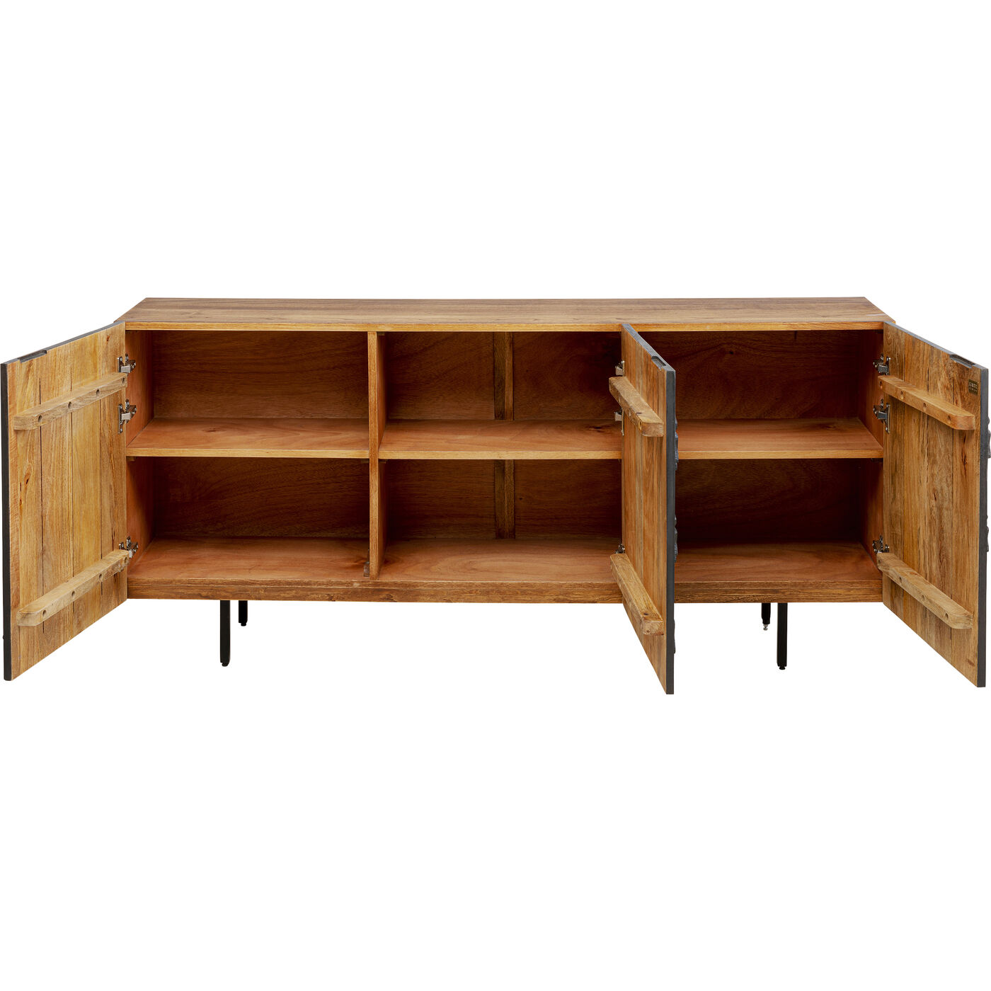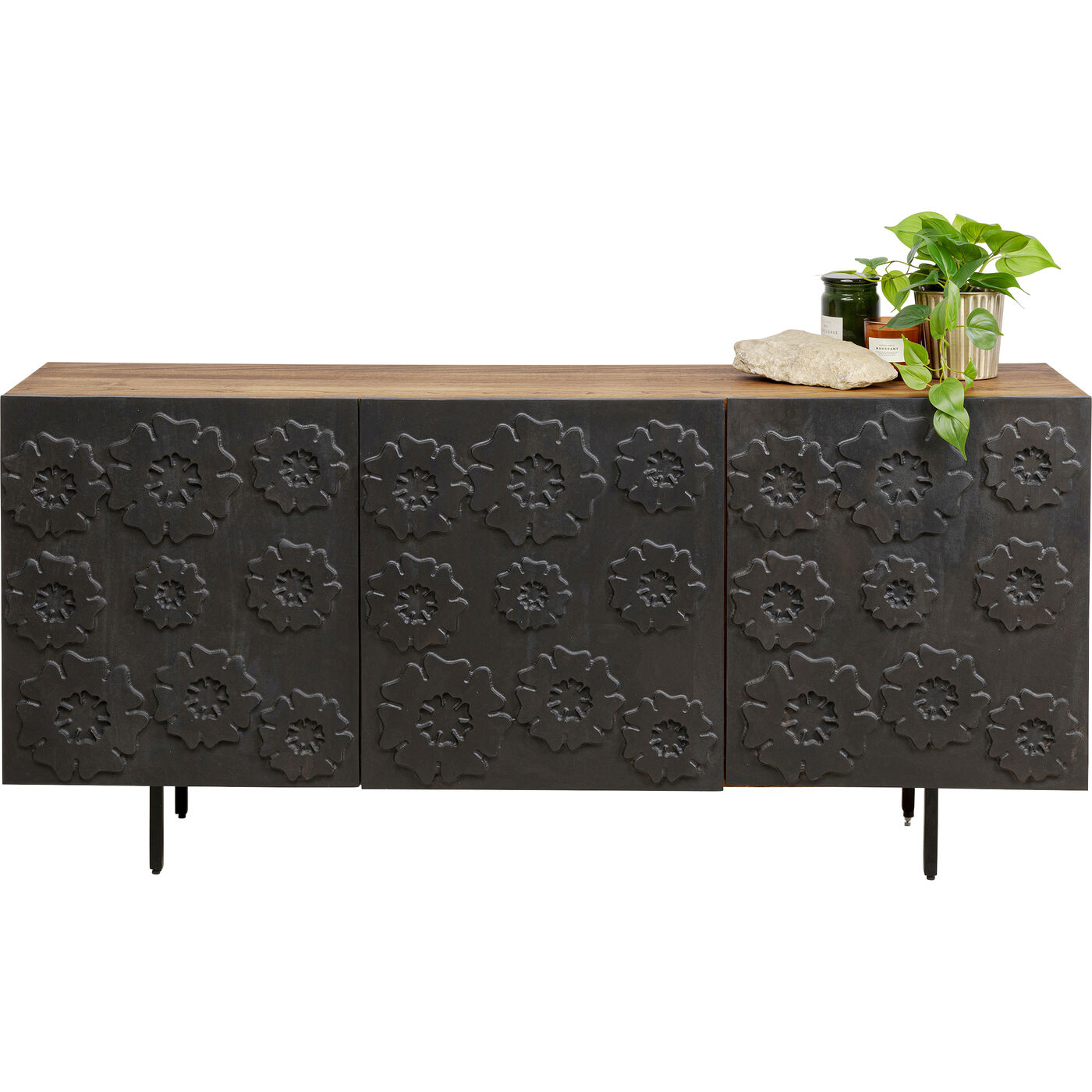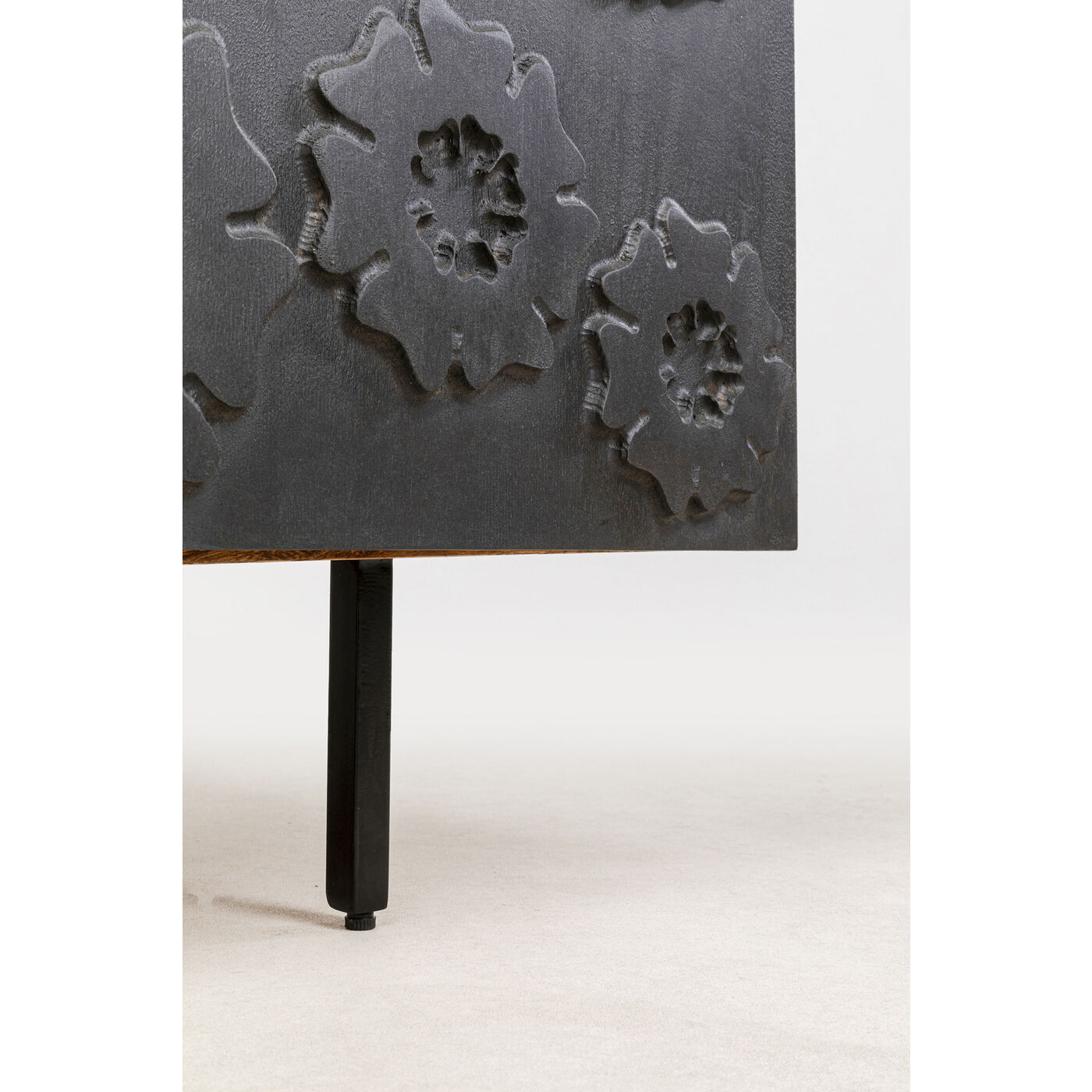 La credenza Fiori è una combinazione di funzionalità e design. La credenza, realizzata a mano, presenta un frontale scuro con un motivo floreale astratto che rende ogni pezzo un opera d arte unica. La credenza è realizzata in legno di mango laccato e gambe in acciaio verniciato a polvere per garantire stabilità ed eleganza. La funzione soft-close e le cerniere regolabili garantiscono una facile gestione. Il design moderno, a cui viene dato un tocco di fascino soprattutto dal frontale, rende la credenza Fiori un mobile di design duraturo. Con la credenza Fiori, portate in casa vostra una combinazione di funzionalità e design.