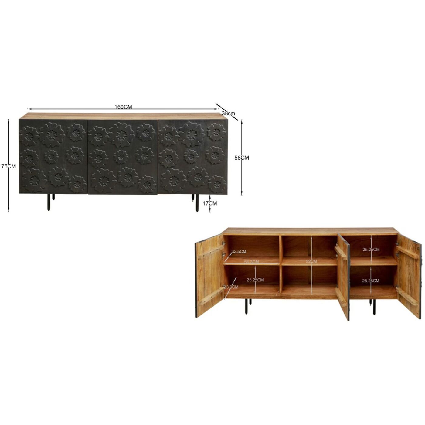 - Credenza in legno massiccio nero e marrone, 75 x 160 x 38 centimetri (a/l/p)