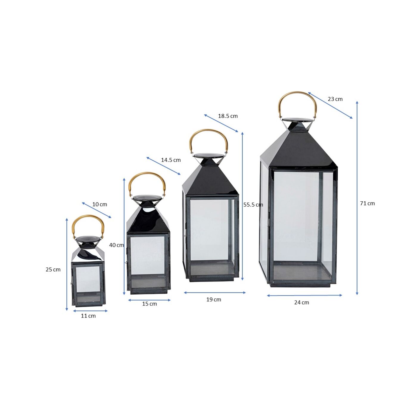 - Von groß bis klein: Laterne hoch 71 cm, mittelhoch 55.5 cm, klein 40 cm, mini 25 cm