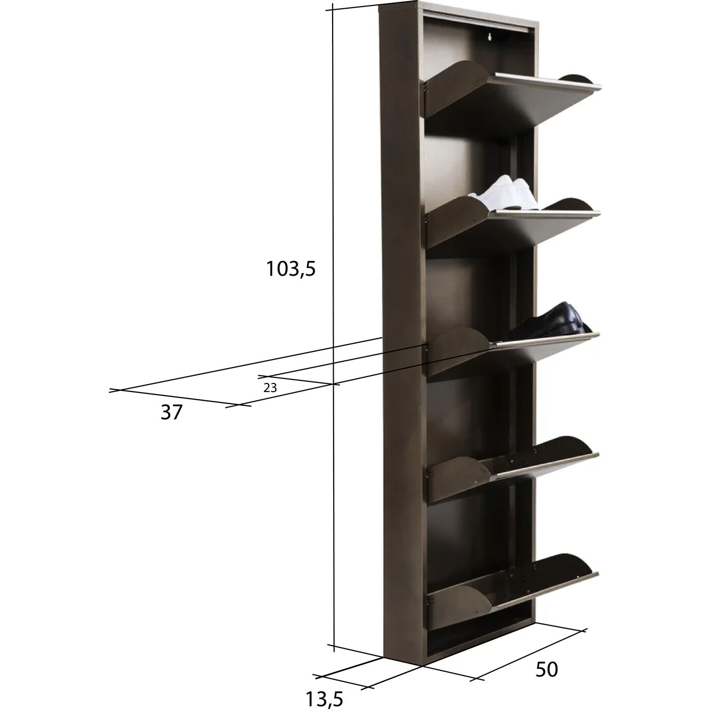 Scarpe davanti alla porta? O distendersi sulle scale? No, preferirei di no. La scarpiera mette fine al caos. Cinque ampi vani ribaltabili offrono molto spazio di archiviazione e protezione dalla polvere. E grazie ai cassetti inclinabili, è facile creare ordine. Con la superficie in bronzo, Caruso fornisce un tocco caldo nel corridoio o nella zona spogliatoio.