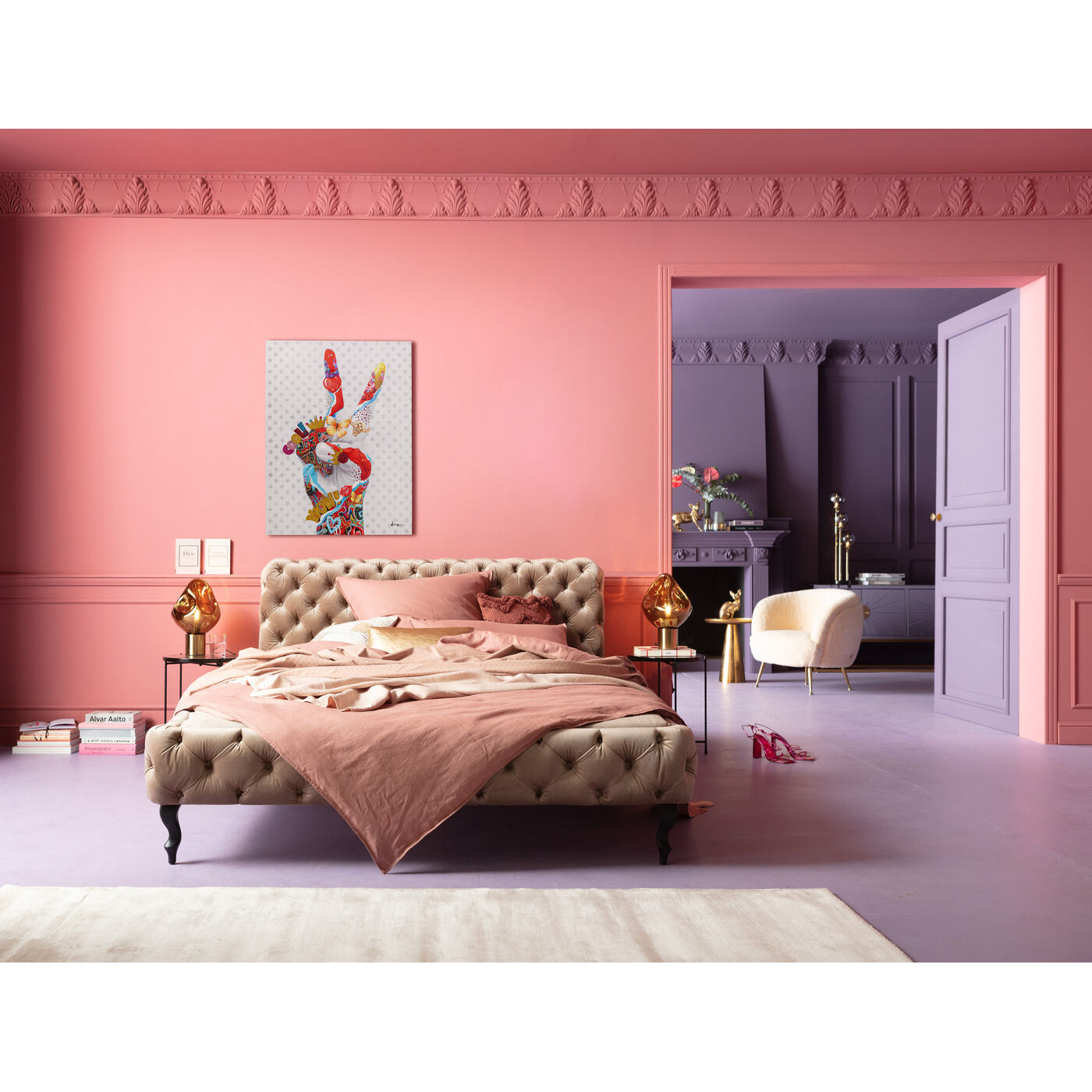 Questo straordinario divano in stile retrò italiano è un vero e proprio eye-catcher e si inserisce perfettamente negli spazi abitativi moderni. Grazie al suo design speciale con lo schienale di colore diverso, può stare liberamente nella stanza e quindi crea un accento inconfondibile. Non solo nel soggiorno, ma anche come accogliente luogo di riposo nella grande camera da letto, questo divano a due posti taglia una bella figura. Il design tipico sottolinea le straordinarie idee abitative in stile KARE e rende questo divano un must have per ogni amante del design.48 cm altezza seduta cintura elastica sospensione.Struttura struttura: fibra di legno a media densità naturale, rivestimento: 30 kg/m³ imbottitura in poliuretano espanso, rivestimento: 100% poliestere (effetto velluto), piedi/piedi: acciaio verniciato a polvere, altezza seduta 48 cm, sospensione cinghia elastica